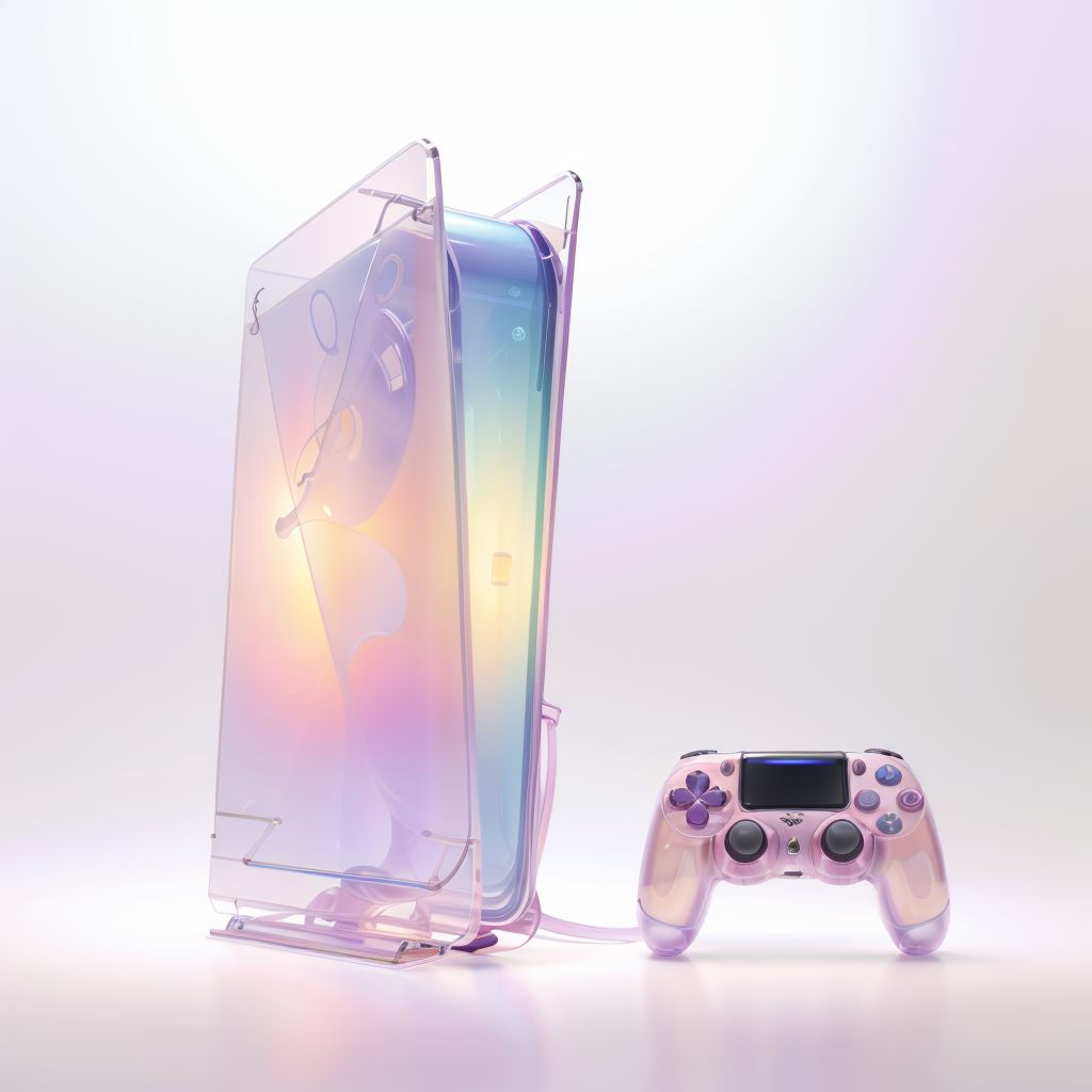 best, masterpiece, HDR, still life, product drawing, playstation_5, see-through, huancai, light gray to light purple gradient background, clean background,