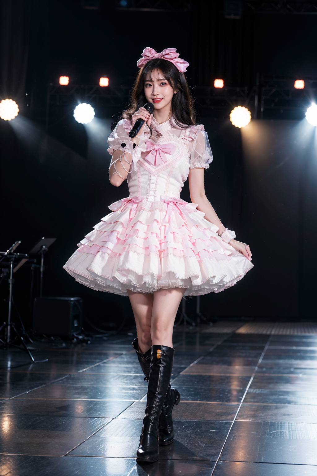 best quality, quality, masterpiece, photorealistic, 1girl, solo, long black hair, looking at viewer, smile, full body, cyb dress, pink dress, frills, see-through short sleeves, wrist cuffs, knee boots, hair bow, hair ornament, stage in the backgorund, stage lighting, stage spotlight, detailed background, audience, holding microphone, singing, <lora:idol_costume_style6_v1:0.7>