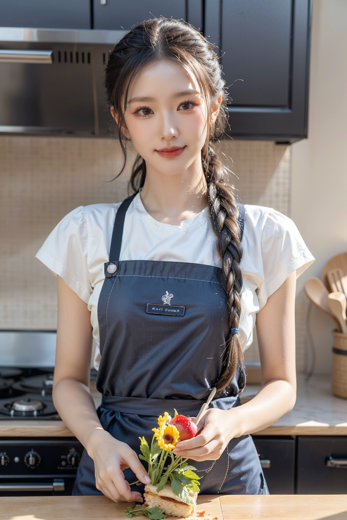 Best quality, masterpiece, ultra high res, raw photo, beautiful and aesthetic,deep shadow, dark theme,(photorealistic:1.4), (1girl, ((smile)), hair braid, flower print kitchen apron, small face), slim body, fit, ((kitchen, cooking)), (((holding delicious food))), ((looking at viewer)), Graceful poise, evocative atmosphere, magnetic presence, refined seduction, captivating mystique, Intricate zentangle patterns, a single female figure, astonishing level of detail, generously endowed, portrait composition, striking perspective, a chaotic masterpiece, gracefully poised, inspired by brutalist architecture, vibrant color palette, undertones, outdoors,