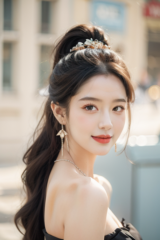 best quality,masterpiece,(photorealistic:1.4),muted color,1girl,high ponytail,pastel palettes \(bang dream!\),dynamic pose,seductive smile,dangle earrings,hair twirling,caesty,chain necklace,simple background,depth of field,<lora:anxiang (1):0.55>,