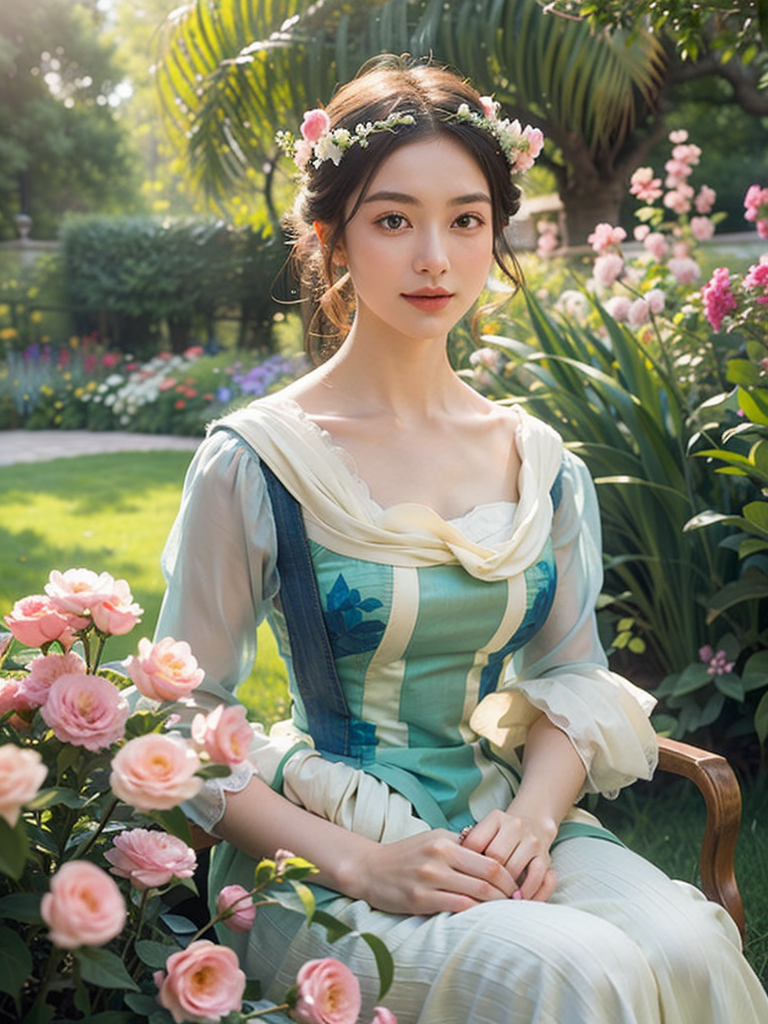 Portrait of a whimsical young lady with an oval face,high cheekbones,and a slender jawline,smiling softly amidst a tranquil garden during the golden hour,painted in the Impressionist style of Claude Monet. The warm sunlight gently illuminates her face,casting a tender glow on her flawless complexion. Her eyes,deep pools of emotion,reflect the enchanting beauty of the surrounding nature. The scene is rich in color and texture,with blossoming flowers and delicate butterflies adding to the ethereal ambiance. The lush garden background is softly blurred into a dreamy haze,embodying the signature loose brushwork of Monet,creating a serene yet vibrant allure.,reminiscent of a soft,dreamlike film light ambiance with a gentle breeze rustling through her flowing locks,