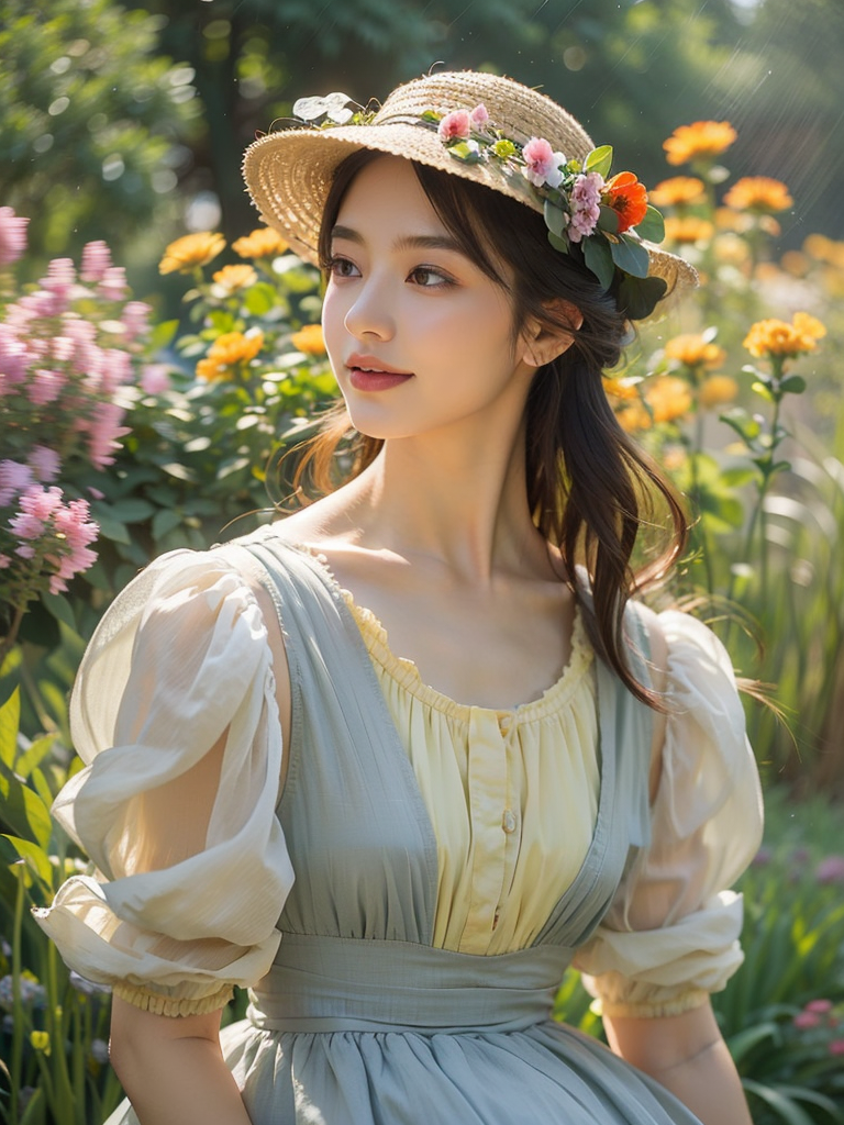 Portrait of a whimsical young lady with an oval face,high cheekbones,and a slender jawline,smiling softly amidst a tranquil garden during the golden hour,painted in the Impressionist style of Claude Monet. The warm sunlight gently illuminates her face,casting a tender glow on her flawless complexion. Her eyes,deep pools of emotion,reflect the enchanting beauty of the surrounding nature. The scene is rich in color and texture,with blossoming flowers and delicate butterflies adding to the ethereal ambiance. The lush garden background is softly blurred into a dreamy haze,embodying the signature loose brushwork of Monet,creating a serene yet vibrant allure.,reminiscent of a soft,dreamlike film light ambiance with a gentle breeze rustling through her flowing locks,
