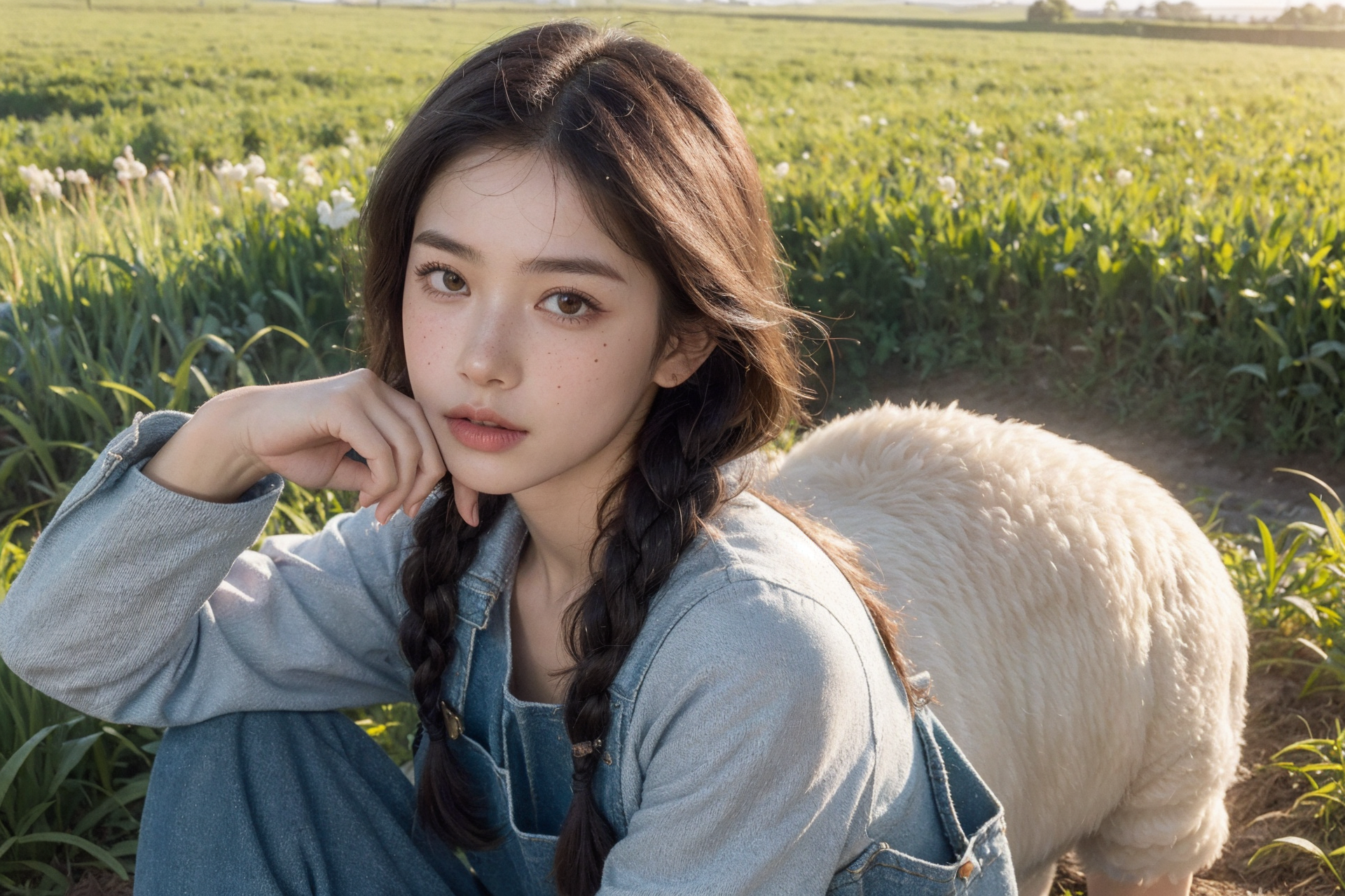 Best quality, ultra-detailed, 8k resolution, (photorealistic:1.4), masterpiece, raw photo, masterpiece, deep shsadow, very detailed hair, perfect finger, good hand (1girl , farmwear, overalls, jumpssuit, farm, farmgirl, braid, freckels), blush, delicate skin, shiny skin farm, field, cow, sheep, hens <lora:ReaLora:0.3> <lora:makina69_karina_v2.1:0.2> <lora:cute tiktok girl mix_V3:0.2>
