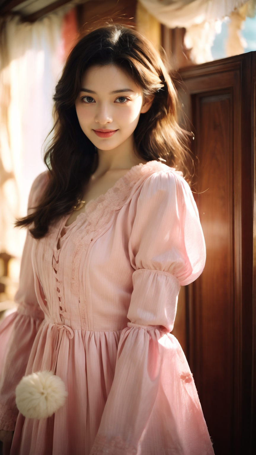 (Realistic),masterpiece,best quality,cinematic lighting,natural shadow,highest detail,looking at viewer,Steadicam Shot, edgRenaissance,1girl,photo of a cute girl,light smile,charming,20yo,Bang Hair.Hair between eyes,wearing Hot pink edgRenaissance,Lace-up,Fringe,Pom-pom,dynamic pose, <lora:edgRenaissanceDress1:0.8>, <lora:add_detail:1>,<lora:rinko_20231004041754:1>,