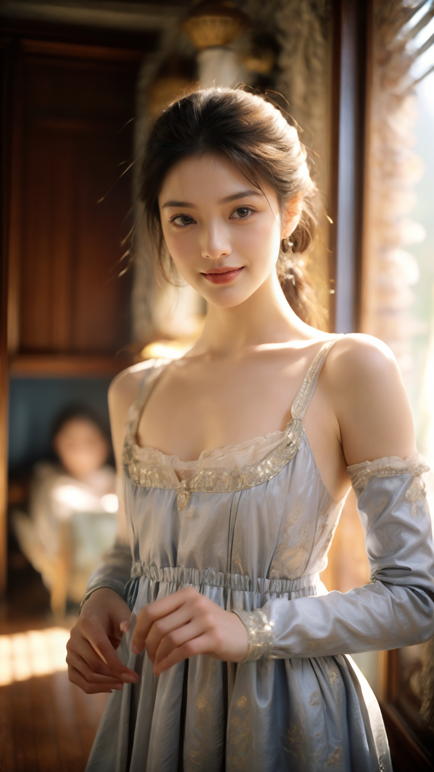 (Realistic),masterpiece,best quality,cinematic lighting,natural shadow,highest detail,looking at viewer,Worm's Eye View, edgRenaissance,1girl,photo of a cute girl,light smile,charming,20yo,Sleek Ponytail Hair.shaved sides,wearing Emerald edgRenaissance,Drape,Studs,Sequin,dynamic pose, <lora:edgRenaissanceDress1:0.8>, <lora:add_detail:1>,<lora:rinko_20231004041754:1>,