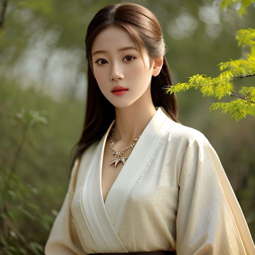 dynamic pose, foliage with Birch tree, girl, japanese, wearing Alabaster Jodhpurs with Polyester images, Snug Necklace, Ultrarealistic, Amusing, American Impressionism, spotlit, high detailed, high detailed face, detailed eyes, high quality face,
