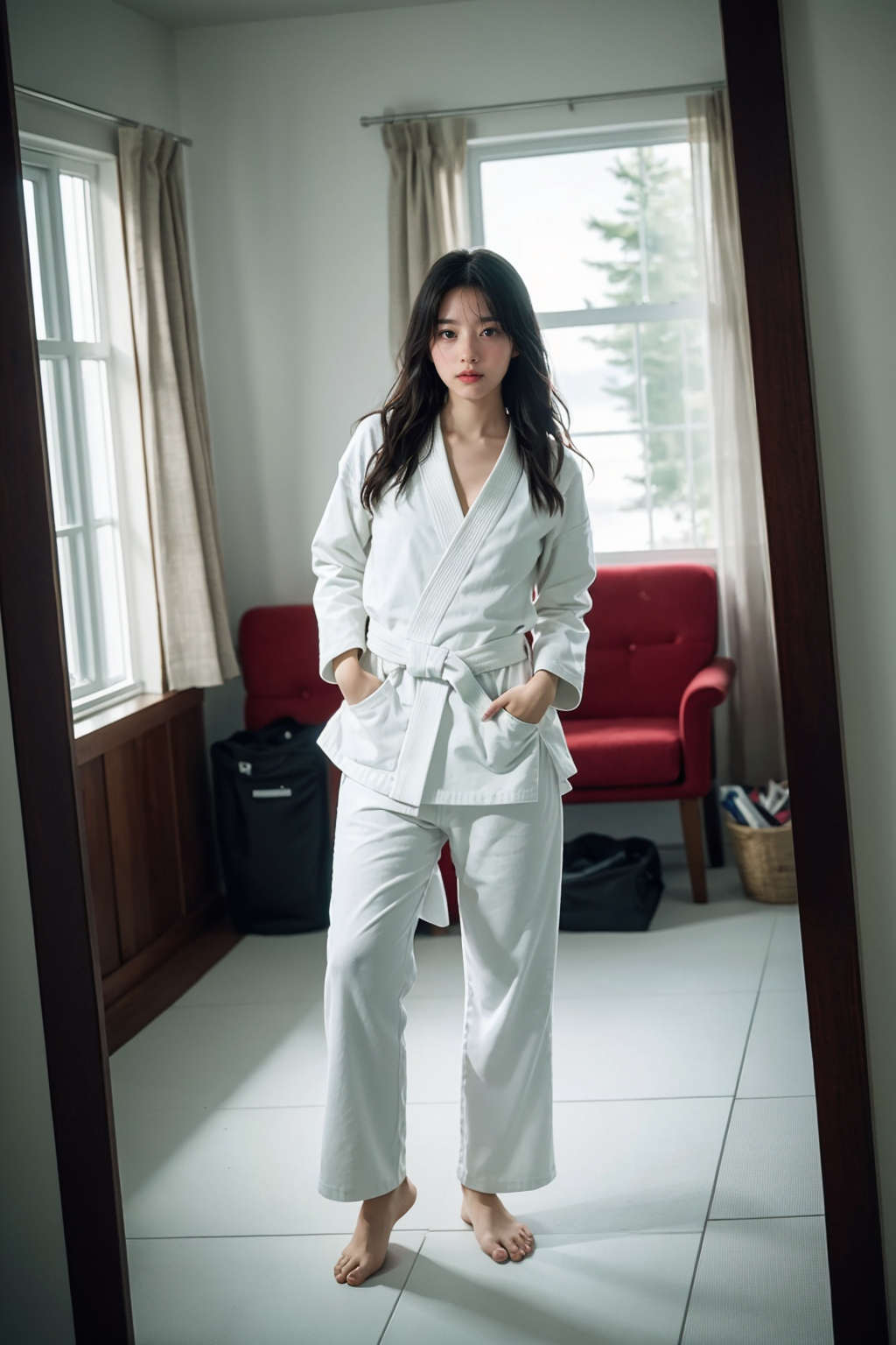 (fullbody shot) of a girl,deep scene depth,(Karena Ng), 23 years old,kawaii,cute, :<, in Isle Royale National Park , doing Judo_, by alfred stieglitz , shot by Canon EOS R Mirrorless Camera , ((SFW)):1.5 ,<lora:PinkNipples:0.4>, <lora:epi_noiseoffset2:0.6>,film grain,silver pointy hair hair