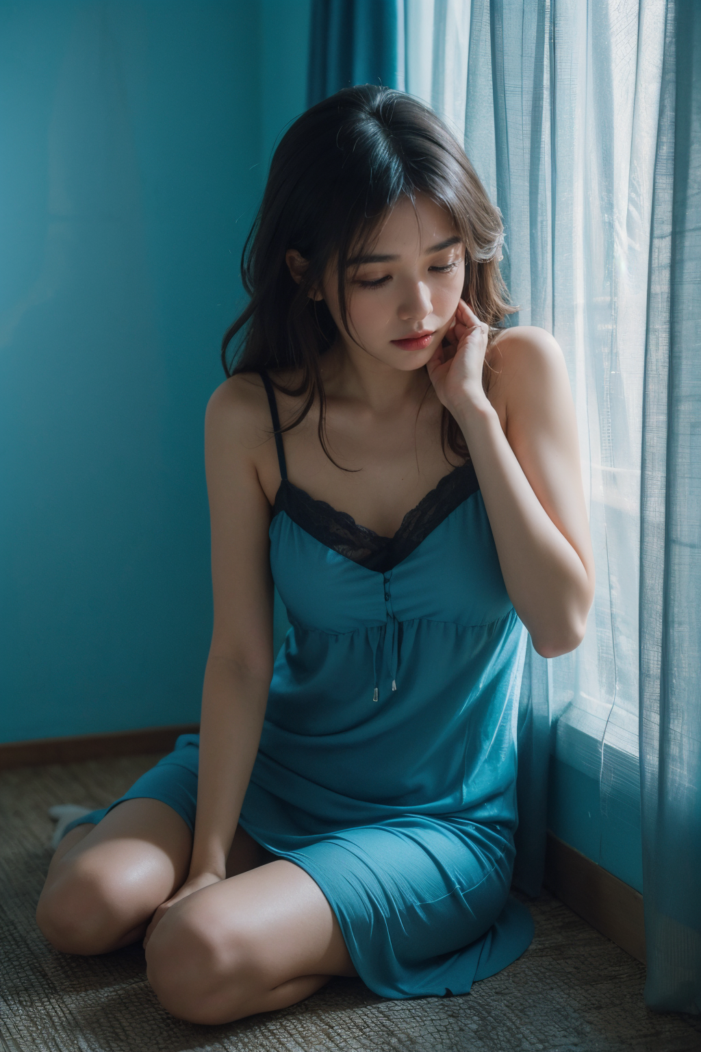 Best quality, masterpiece, ultra high res, photorealistic, raw photo, unity 8k wallpaper,night,dappled moonlight, dark blue theme,dim lightingm, 1girl,see-through dress,black nightgown,messy hair, (sad,disappointed, crying, tears:1.1), empty room,(sittig on floor, against wall:1.1), window, transparent curtains,<lora:lichen:0.7>