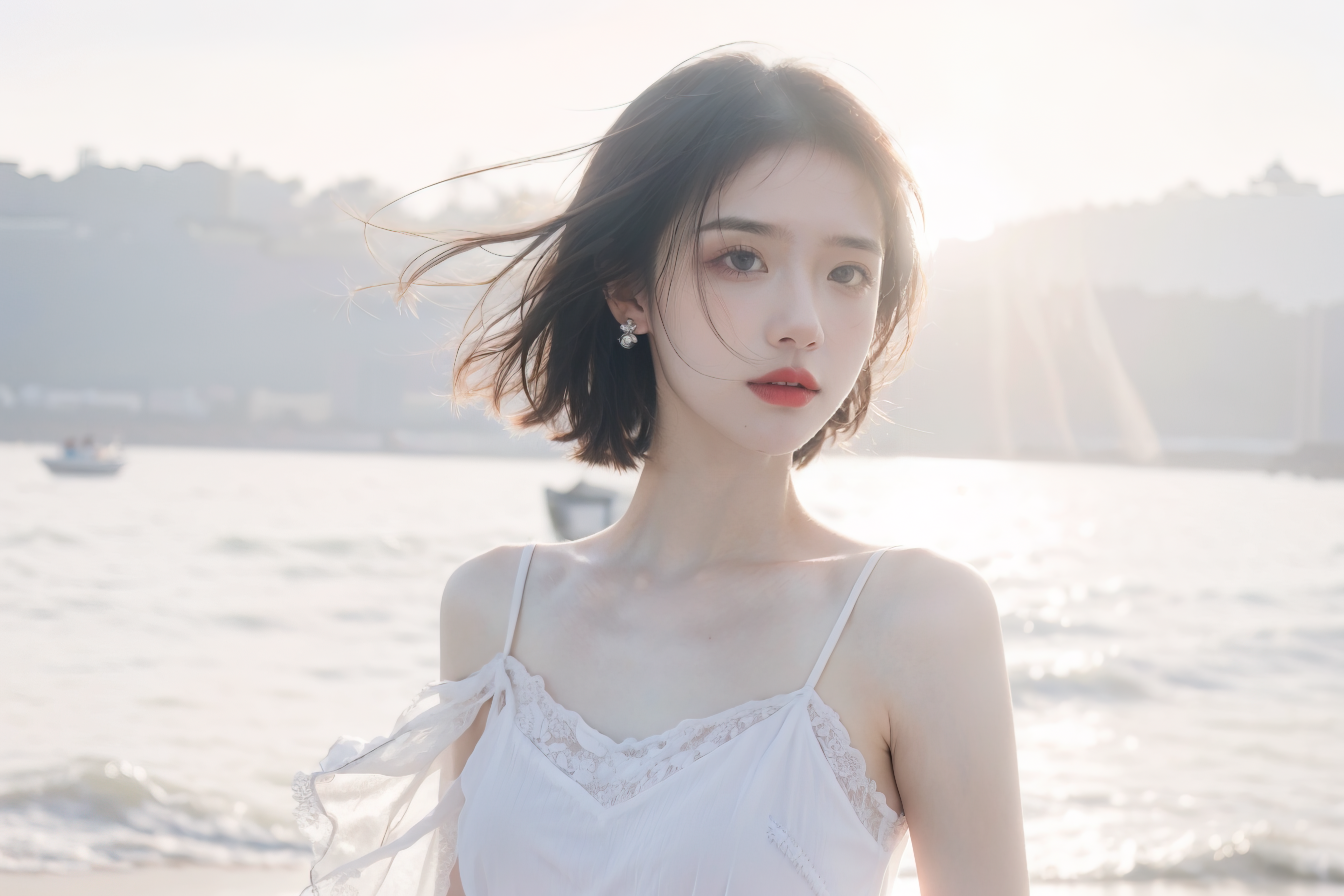 1girl, seaside, waves, sunrise, backlighting, lens flare, wind,(upper body:1.5),(off shoulders, camisole:1.1), (short hair,floating hair, rouge (makeup), beautiful detailed eyes, earrings:1.1), <lora:MengX girl_Mix_v30:1>,