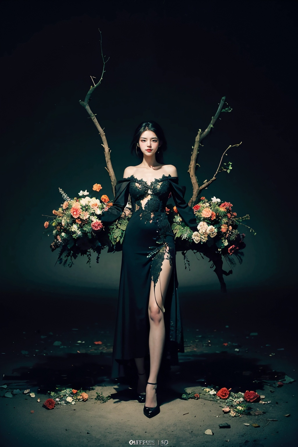 portrait of the most beautiful form of chaos, elegant, a brutalist designed, vivid colours, romanticism, by james jean, roby dwi antono, ross tran, francis bacon, michal mraz, adrian ghenie, petra cortright, gerhard richter, takato yamamoto, ashley wood, an evil girl wearing intricate dead details flowers, intricate flowers as dress, ((decay and spooky)), plants and branches, atmospheric, trending on artstation. 8 k masterpiece, ((symmetry))