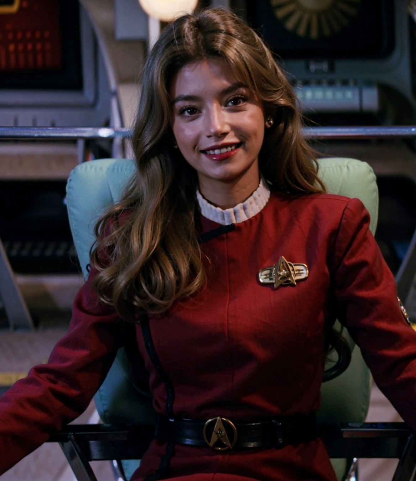 young latino woman with blond long hair in twokunf ,in a chair,smiling,on a starship,badge<lora:TWOKunf:0.8>