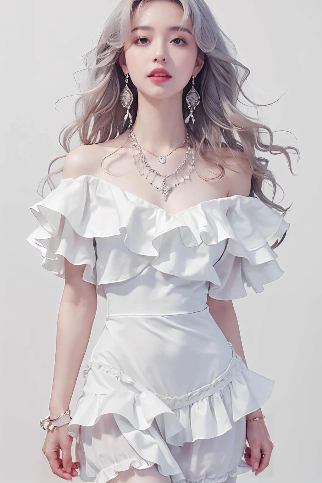 1girl,solo,jewelry,long hair,necklace,earrings,simple background,looking at viewer,cowboy shot,off shoulder,dress,white background,wavy hair,bare shoulders,grey eyes,lips,parted lips,skirt,frills,__yanse__ dress,