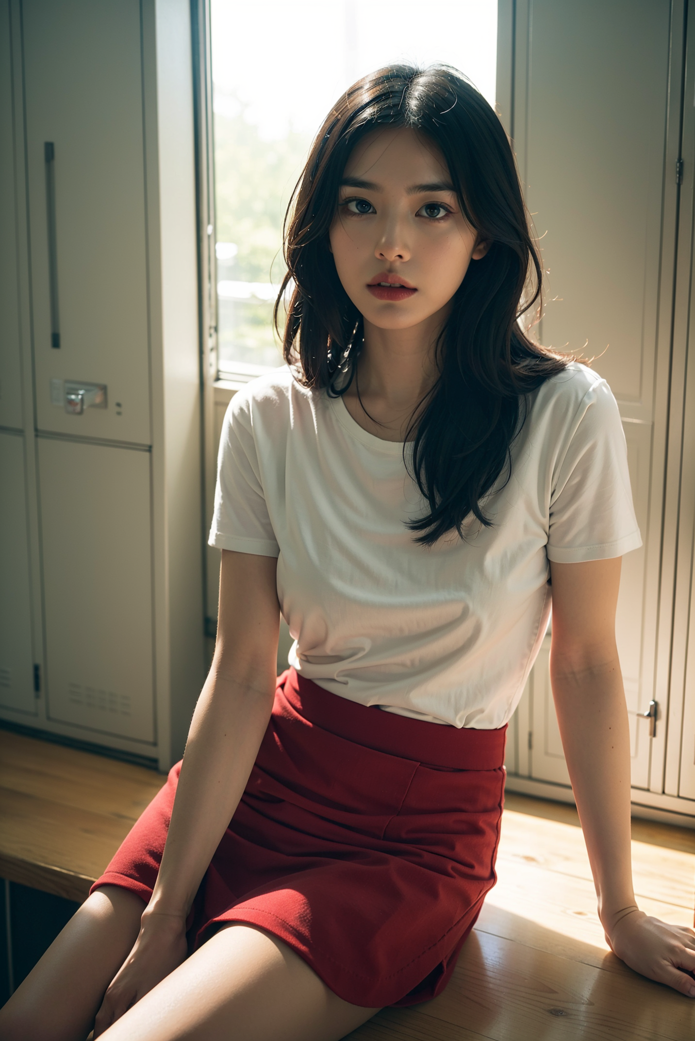lifelike rendering, immersive atmosphere,impeccably detailed, visually stunning, transfixing looks,emotive depth, artistic emotionality, compelling glances, 1girl, solo, sitting, lean against white wall, minimalism background, skirt, black hair, locker, shirt, parted lips, lips, short sleeves, indoors, sunlight, white shirt, red skirt, fujifilm retro, no<lora:actressSatomi_v10:0.4:FACE>, rejuvenation, retro, film grain