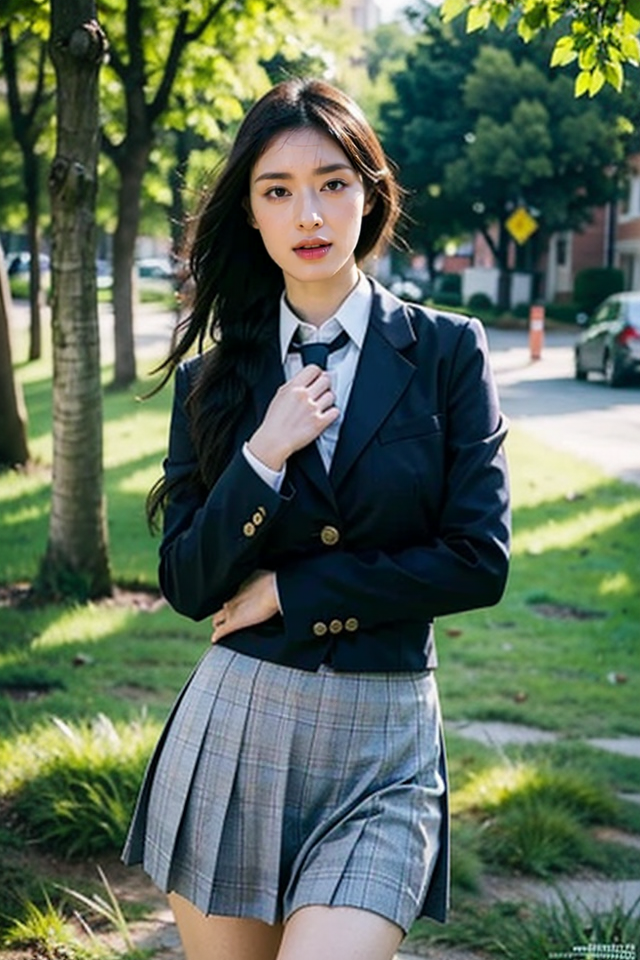 1girl,ashford_academy_uniform,sexy pose,best quality,masterpiece,illustration,an extremely delicate and beautiful,CG,unity,8k wallpaper,Amazing,finely detail,masterpiece,official art,extremely detailed CG unity 8k wallpaper,incredibly absurdres,huge filesize,ultra-detailed,highres,extremely detailed,beautiful detailed girl,realistic,full frontal,outdoors,skirt,light contrast,<lora:KuriyamaChiaki:0.8>,
