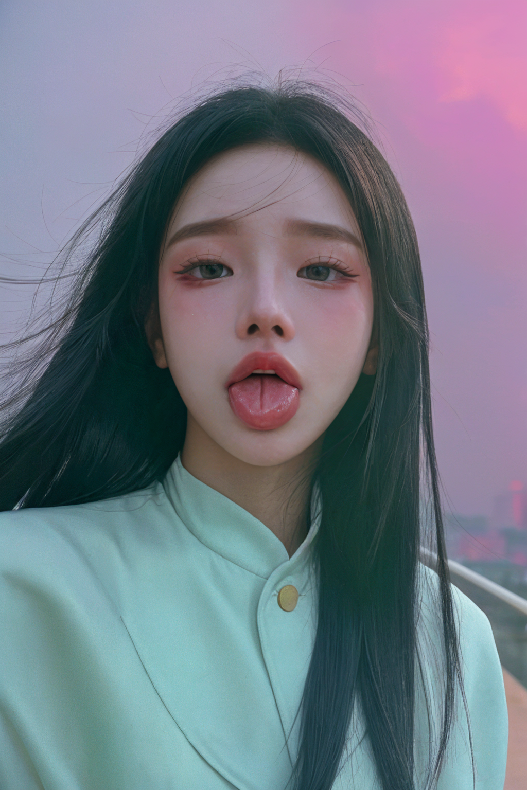 a fashion lookbook portrait of a female fashion model wearing haute couture, experimental, shot on kodak professional medium format film, liminal industrial background in, PlatinumBlonde, (smoke|fireworks:1.05), (dawn|dusk:1.05), (summer|spring:1.05), 1girl, straight long hair, no makeup, (close up:1.4), (half-closed eyes:0.6), (painful:1.2), (disgust:1.4), (embarrassed:1.2), (open mouth:1), (tongue out:1), <lora:leeae_ai:1>, <lora:eye_size_slider_v1:-1.2>