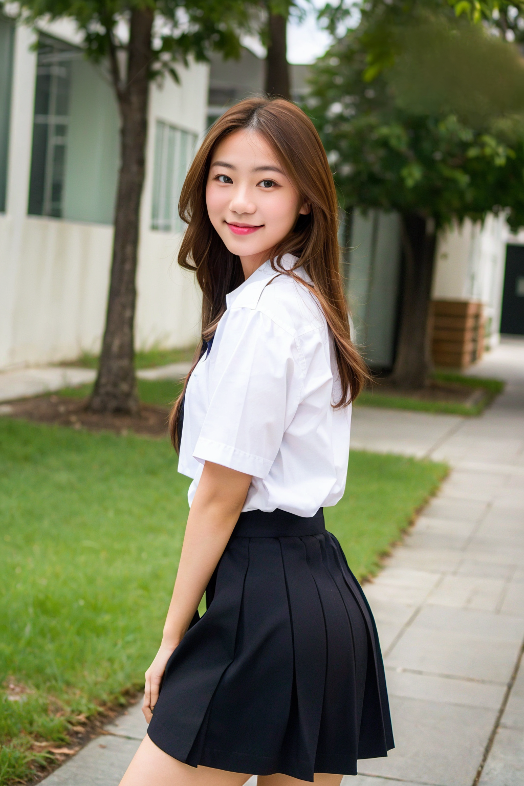 (best quality:1.4), (ultra highres:1.2), (photorealistic:1.4), (8k, RAW photo:1.2),(portrait shot:1.3), ppimpimx, 1girl, solo, long hair, looking at viewer, smile, brown hair, brown eyes, school uniform, white shirt, black skirt, outdoors, <lora:ppimpimx-06:0.6>