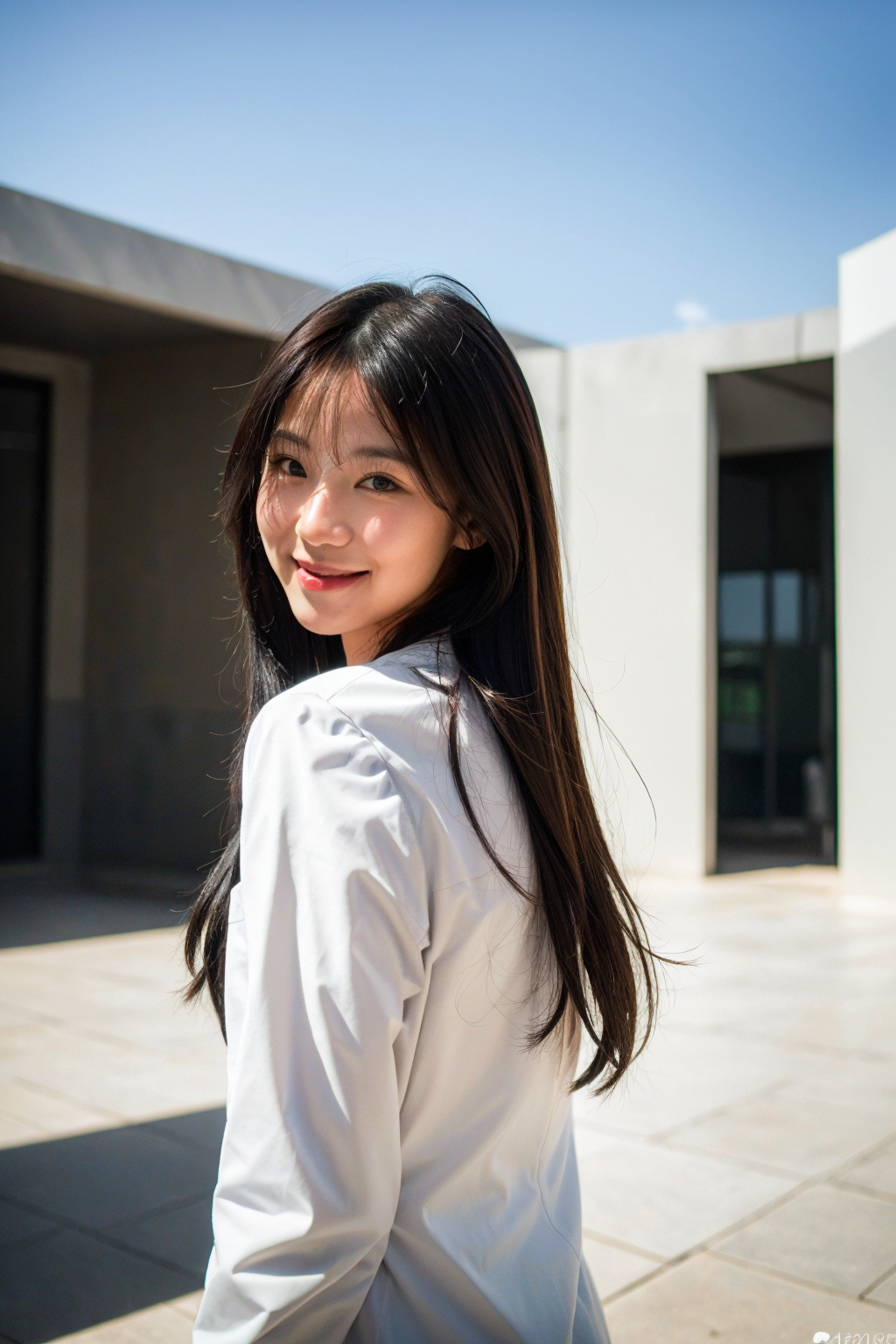 (best quality:1.4), (ultra highres:1.2), (photorealistic:1.4), (8k, RAW photo:1.2),(portrait shot:1.3), ppimpimx, 1girl, solo, long hair, looking at viewer, smile, black hair, brown eyes, white business suit,<lora:ppimpimx-06:0.6>