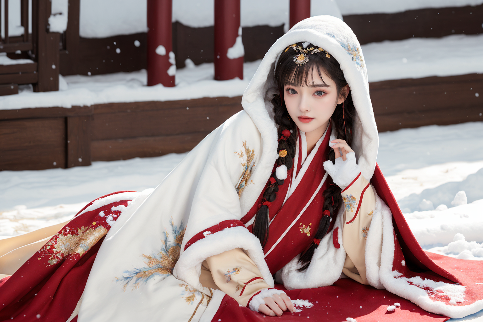 1 girl, (lying:1.35), Hanfu, (Winter hanfu), (cloak, headwear), (snow:1.2), <lora:Winter_Hanfu:0.65>, (masterpiece,best quality:1.5), ultra realistic,32k,RAW photo,(high detailed skin:1.2), 8k uhd, wide shot:1.2)