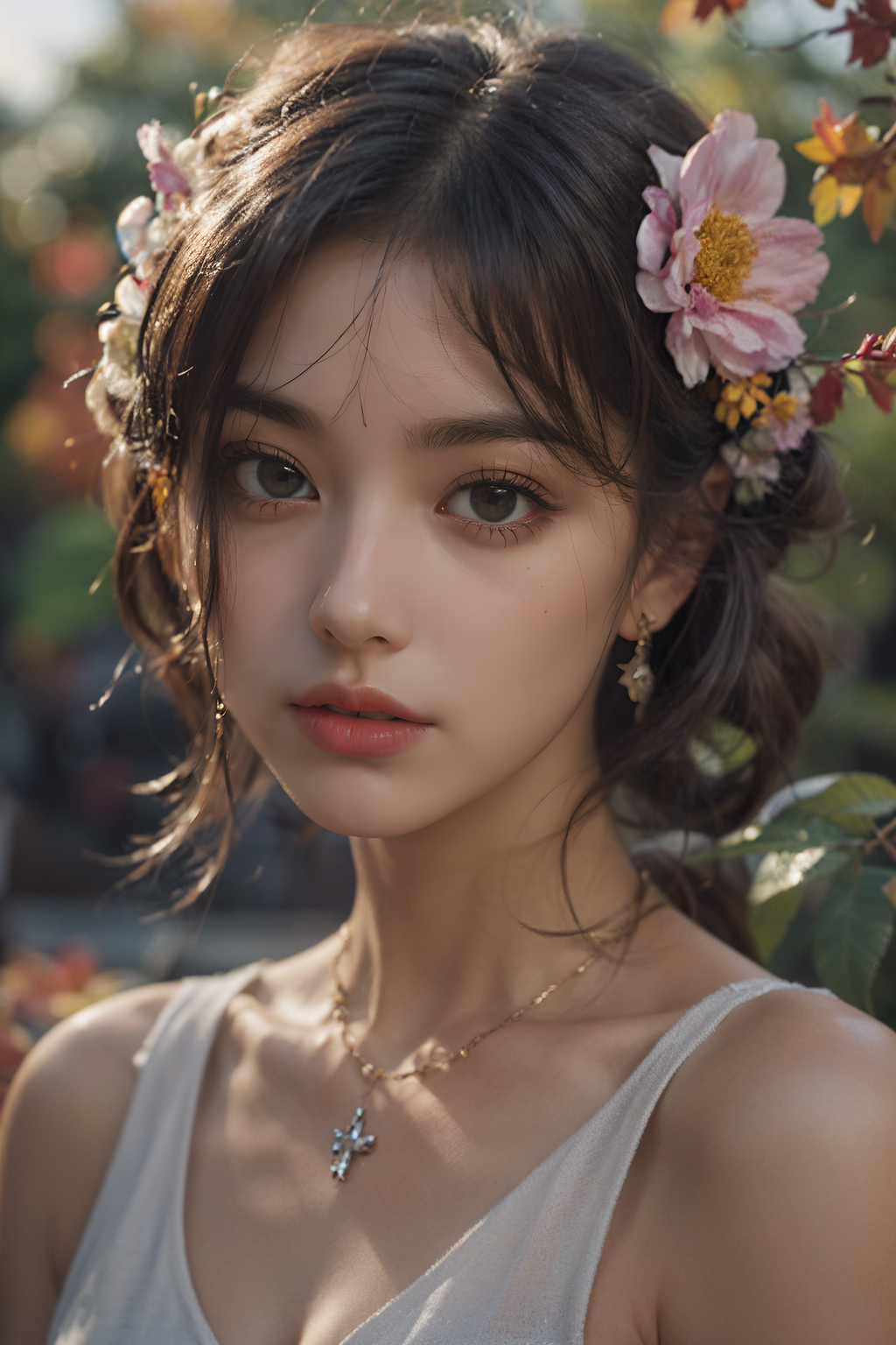 (RAW photo, best quality), (realistic, photo-realistic:1.30),8k uhd, dslr, soft lighting, high quality, film grain,, masterpiece,ultra realistic,32k,extremely detailed CG unity 8k wallpaper, best quality,(autumn day ),1girl ,portrait,hair decoration,necklace ,eardrop, (flower)<lora:add_detail:1>, <lora:FilmVelvia2:0.4>, soft lighting