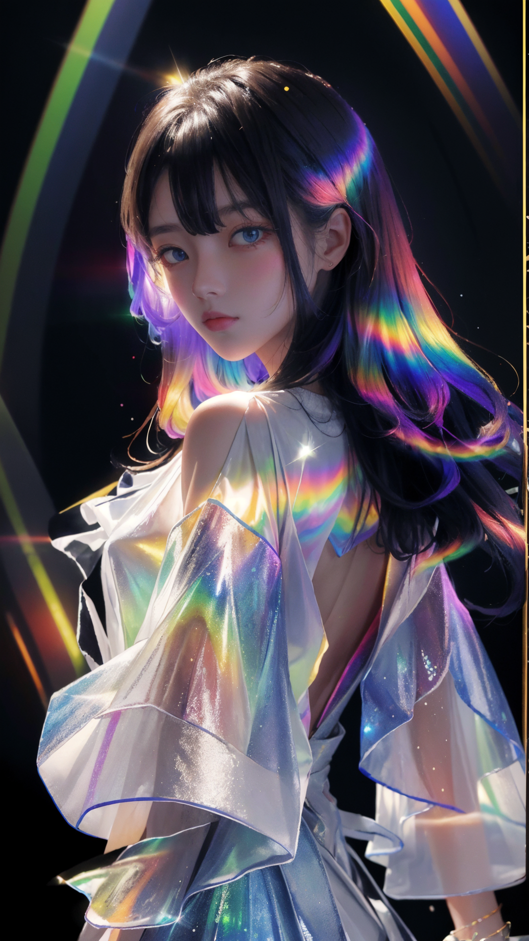 masterpiece, best quality,highres, 1girl, liuli2, tall, long straight hair, perfect stature, white dress, fashion pose, bangs, look_at_viewer, chromatic dispersion,metallic_lustre, see_through, (tansparent_plastic:1.3), coloured glaze, Polychromatic prism effect, rainbowcore, iridescence/opalescence, glowing colors, aluminum foil, Glowing ambiance, building background, (portrait:1.5), look back, <lora:liuli2:0.7>, Tyndall Effect
