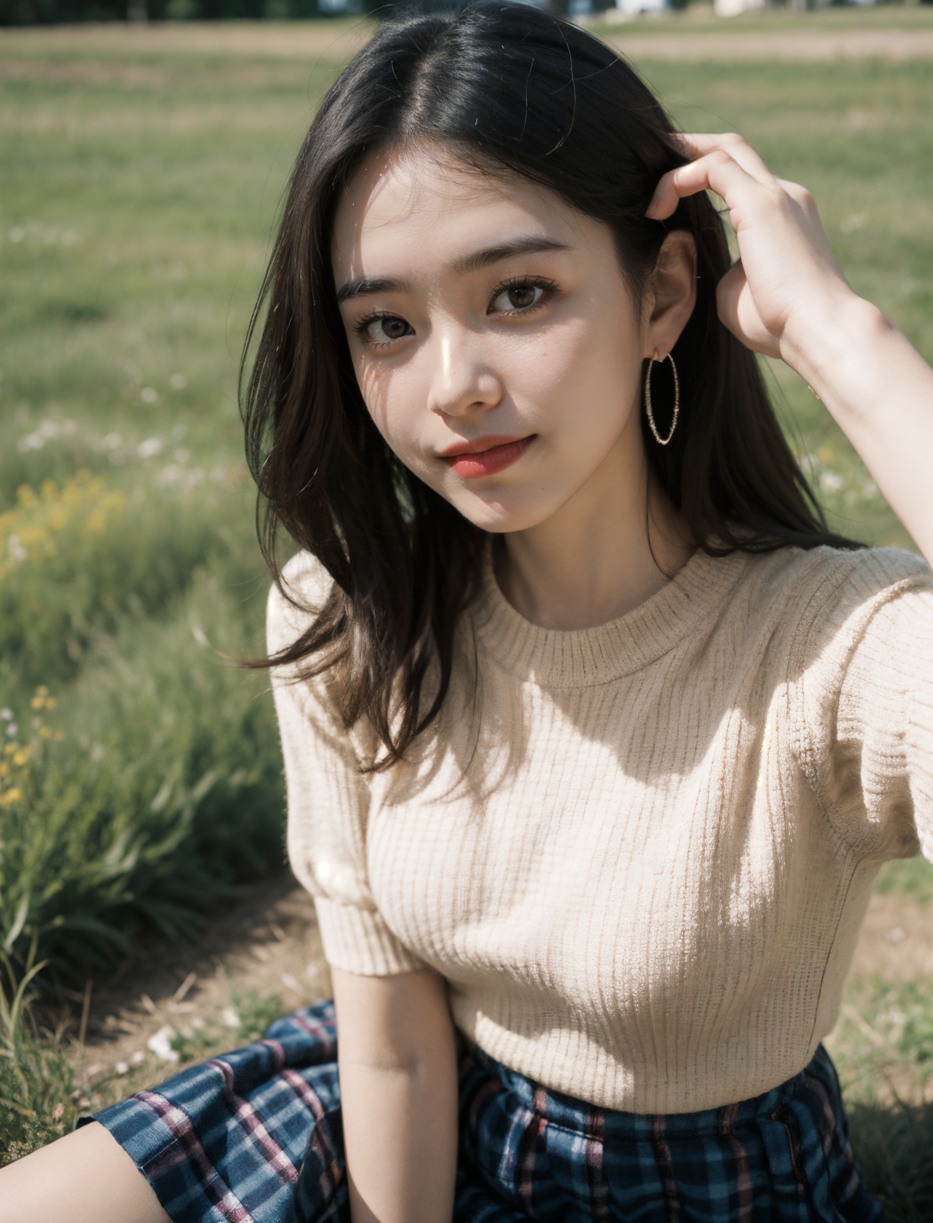 best quality,masterpiece,(photorealistic:1.4),1girl,plump,light smile, medium breasts,No one else in the background, in a meadow, Pleated skirt in checkered plaid, manicure, White jumper with cartoon bear design, drop earrings, stretch, Cartoons t-shirt, from above,Short sweaty hairs on the face