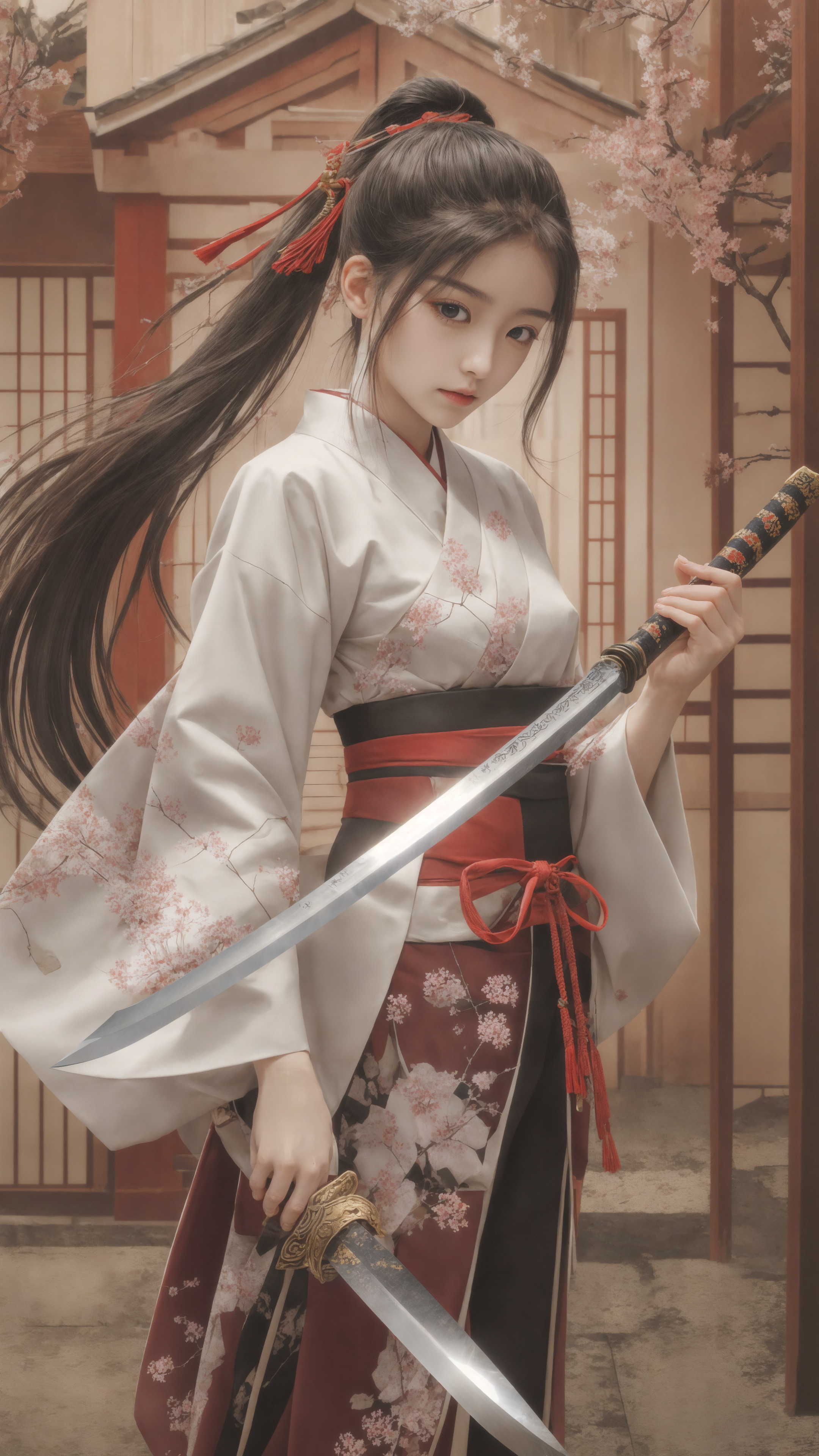 masterpiece, best quality,highres,, Japanese buildings, sakura,1girl holding japanese blade, holding sword, metal blade,Freshly sheathed, Iaido,chinese traditional clothes,Floating petal,<lora:Chinese style_20230607154437-000017:0.3>