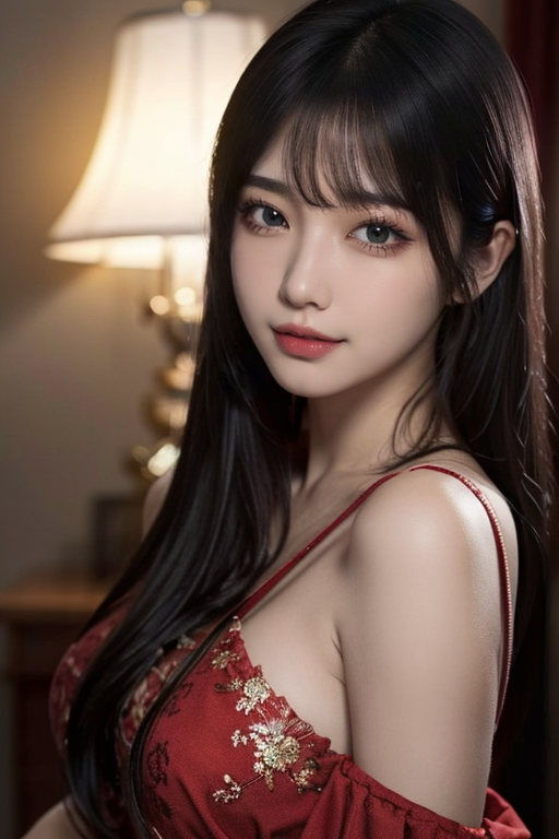 masterpiece, best picture quality, high quality, beautiful girl, Japanese, Japanese school girl, popular Korean makeup, detailed, swollen eyes, detailed eyes, detailed skin, beautiful skin, ultra high resolution, (reality: 1.4), very beautiful, slightly younger face, beautiful skin, slender, (ultra realistic), (illustration), (high resolution), (8K), (highly detailed), (best illustration), (beautifully detailed eyes), (super detailed), (wallpaper), (detailed face), looking at viewer, fine details, detailed face, pureerosfaceace_v1, smiling, looking straight ahead, looking straight ahead, angle from waist up, realistic photo, bright lighting, professional lighting, black hair (some green), long hair, dark ruins, big red moon, gorgeous red and black dress, mature woman, long stylish bangs, <lora:jpcosermix:0.6>