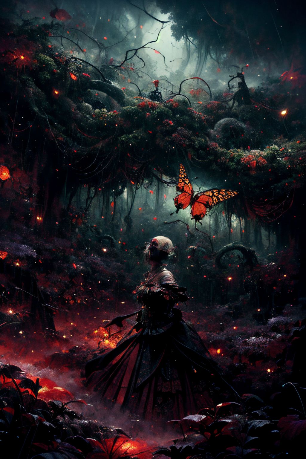 1girl,masterpiece,official art,unity 8k wallpaper,ultra detailed,beautiful and aesthetic,best quality,intricate details,(dynamic angle:1.4),glowing skin,portrait of the most beautiful form of chaos,elegant,a brutalist designed,vivid colours,romanticism,atmospheric,depth of field,photo of a girl wearing intricate butterflies and flowers as dress,arms up,((decay and spooky)),firefly glow,dark and moody,plants and branches,atmospheric,trending on artstation. 8 k masterpiece,((symmetry)),(a lot of colorful butterflies and purple fireflies:1.3),(purplish glow),(horror art by apterus:1.2), monster <lora:monster:0.6>, <lora:difConsistency_detail:0.4>, zwd, zuowangdao <lora:zwd_v2:0.7>,