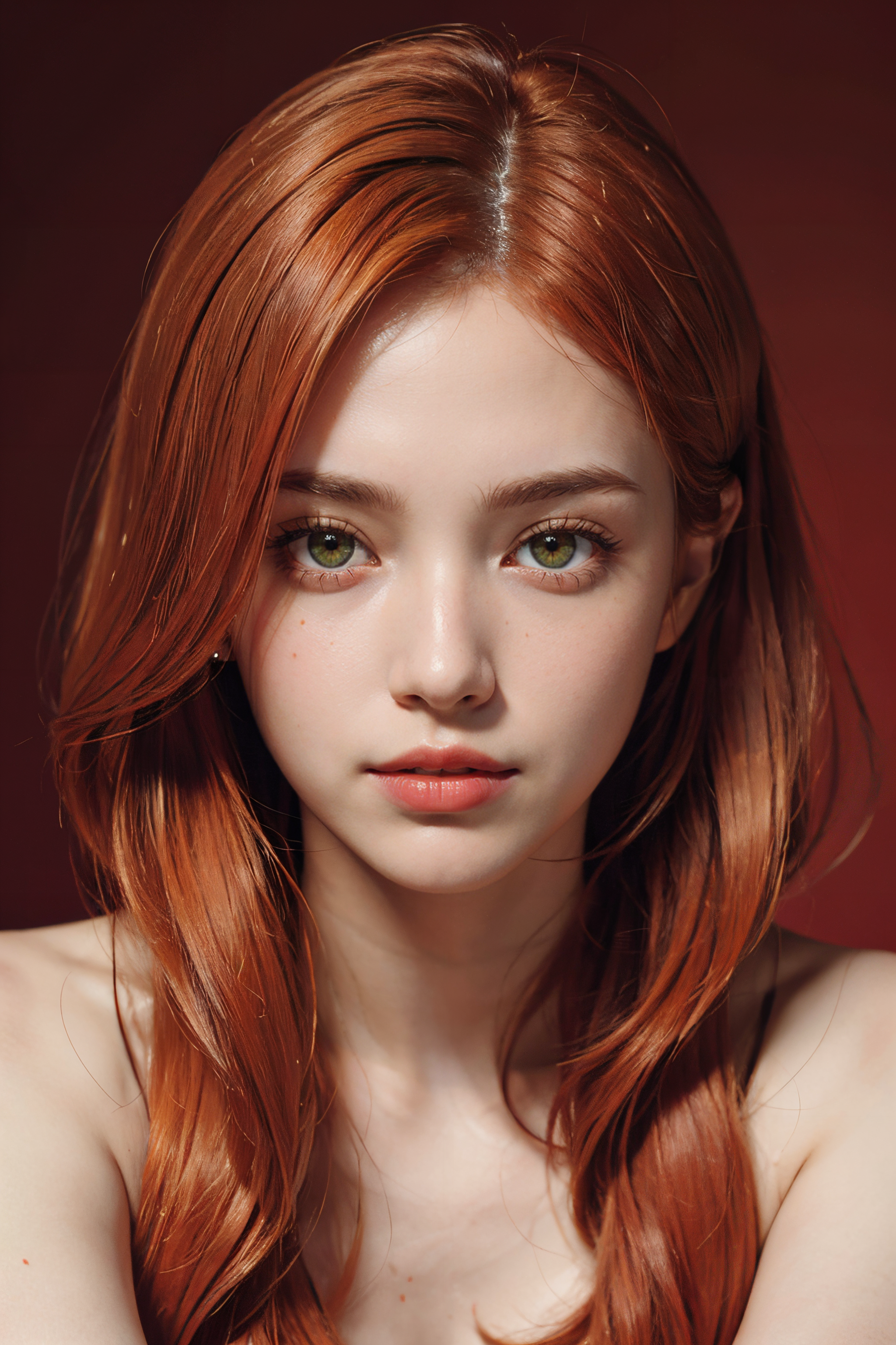 simple_background, red_background, masterpiece, realistic, best quality:1.2, 1girl, beautiful face, portrait, upper body, orange_hair, green_eyes, cute, beautiful woman,