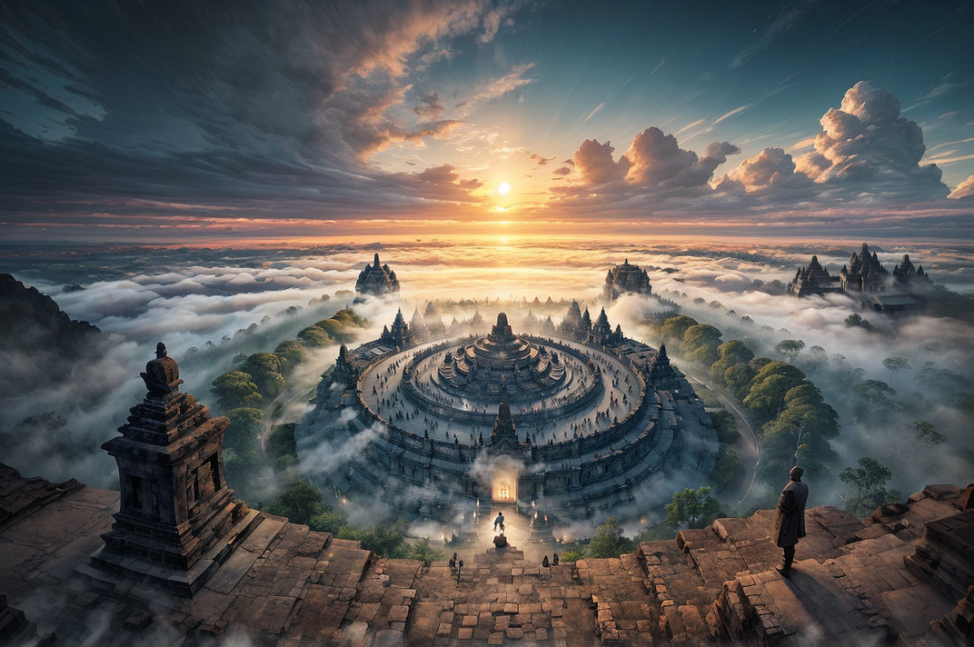 a man in front of gigantic candi buddha building on mountain, statue of buddha, reflective floor, epic, fog, dawn, dramatic lighting, dim light, forest, cliff, <lora:ARWCandiBuddha:1> advntr, <lora:epi_noiseoffset2:0.6> <lora:add_detail:0.4>