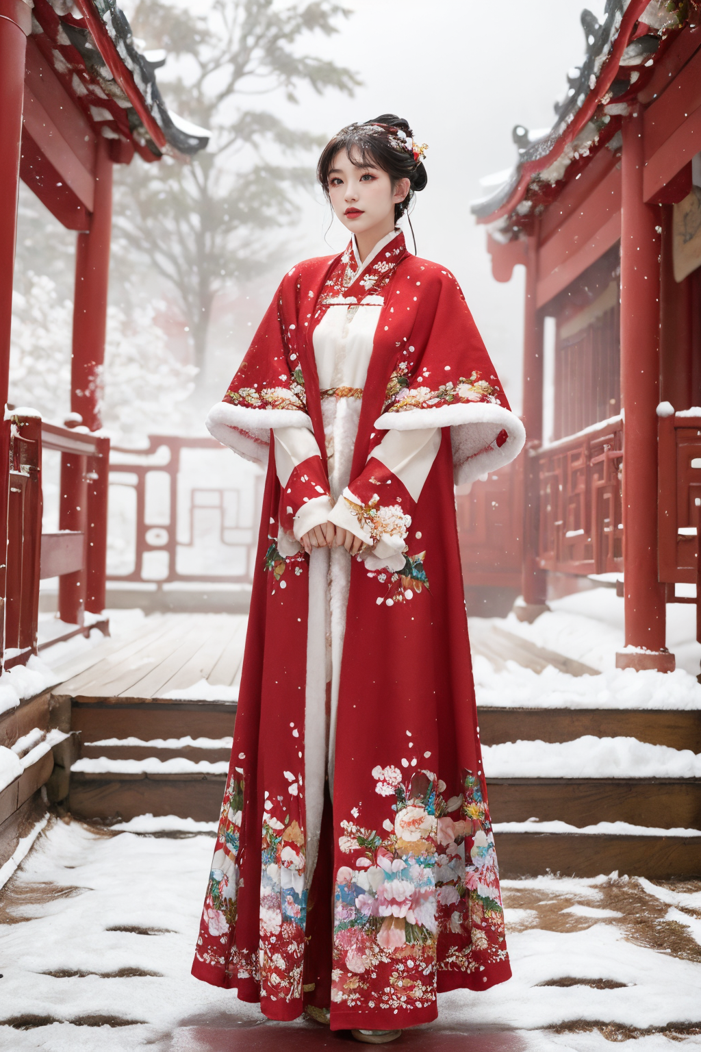 1girl,red hanfu,CCC, solo,(floral_print:1.2),(winter hanfu:1.2), (cloak:1.2), (fog:1.1) (snow:1.3),ancient chinese theme, <lora:TCTH-dreamgirl-5:0.7:FACE>,cold light,dynamic pose,(cowboy shot), vibrant colors,stunning environment ,soft lighting,gorgeous light and shadow