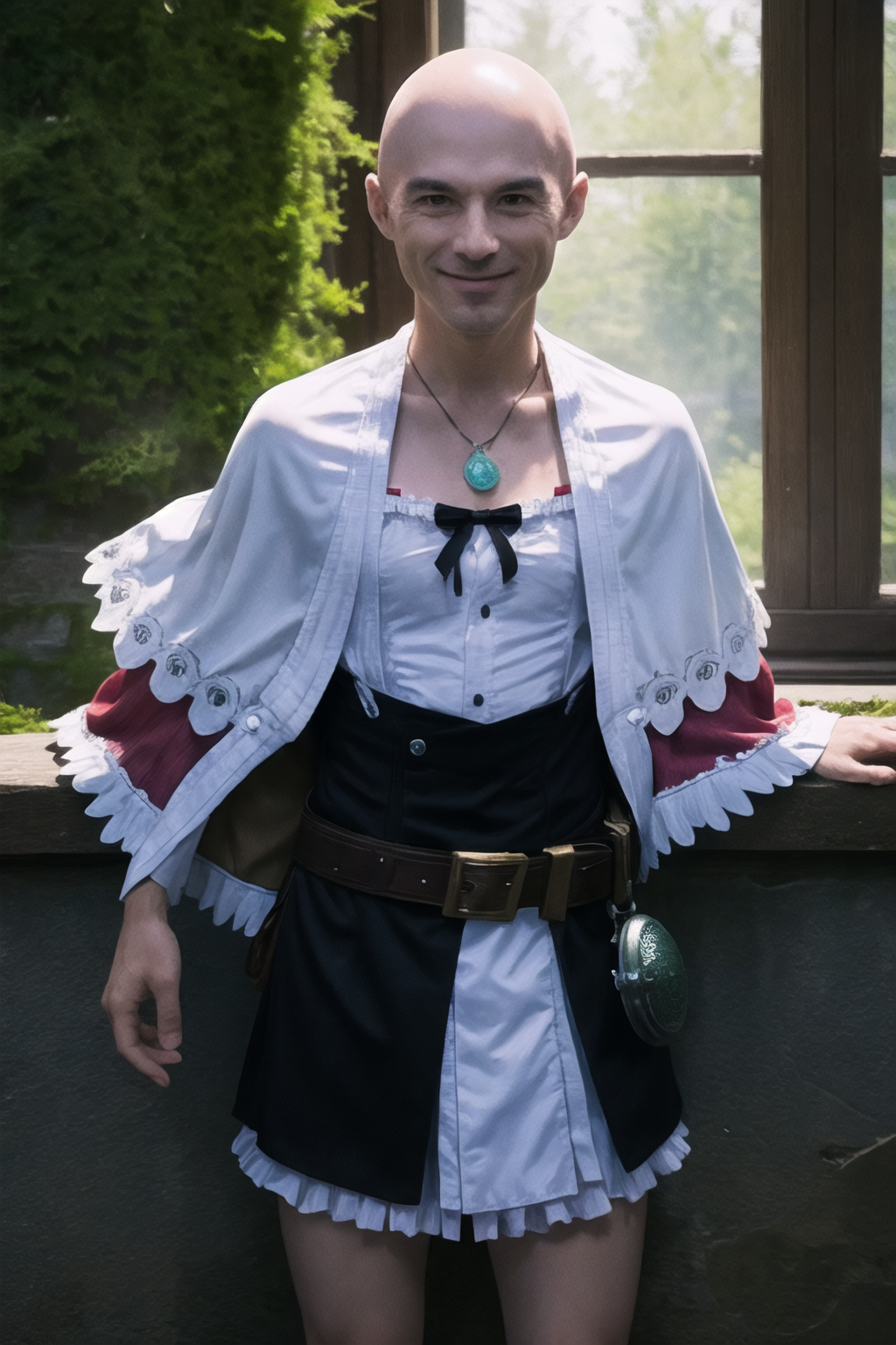 (best quality:1.4), (ultra high res:1.2),(RAW photo:1.2), photoreaslistic, looking at viewer,dynamic lighting, detailed face, (1man:1.5), (50 years old:1.3), BREAK (bald hed:1.5), BREAK from front, (cute smile:1.2), (rorona_cos:1.4), <lora:rororina_cos_V1_1:0.8:MIDD>, cowboy shot, dynamic pose,