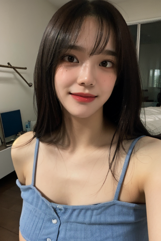 1girl,(masterpiece:1.2), (best quality:1.2), (extremely detailed), selfie from center front, (extremely detailed face), ((ultra-detailed eyes and pupils)), (ultra detailed), 8k, photorealistic, pretty face, smile, instagram shot, instagram style, in the bedroom, looking at viewer, facing front, perfect skin, cinematic lighting, black eyes, upper body, portrait photo, no makeup, nikon RAW photo, 8k ,Fujifilm XT3, photorealistic, detailed face, fair skin, perfect shape, indoors, dim lighting, (looking at viewer:1.2), t-shirt, armpit, bangs, <lora:sejeonglorashy:1>
