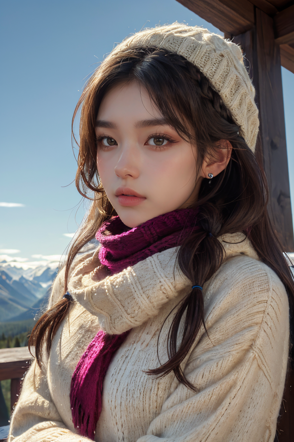 masterpiece,ultra realistic,32k,extremely detailed CG unity 8k wallpaper, best quality,(winter day ),lady ,necklace ,eardrop, Glacier National Park, United States, ( Magenta Styling with a scarf ) , light brown hair hair braid ,