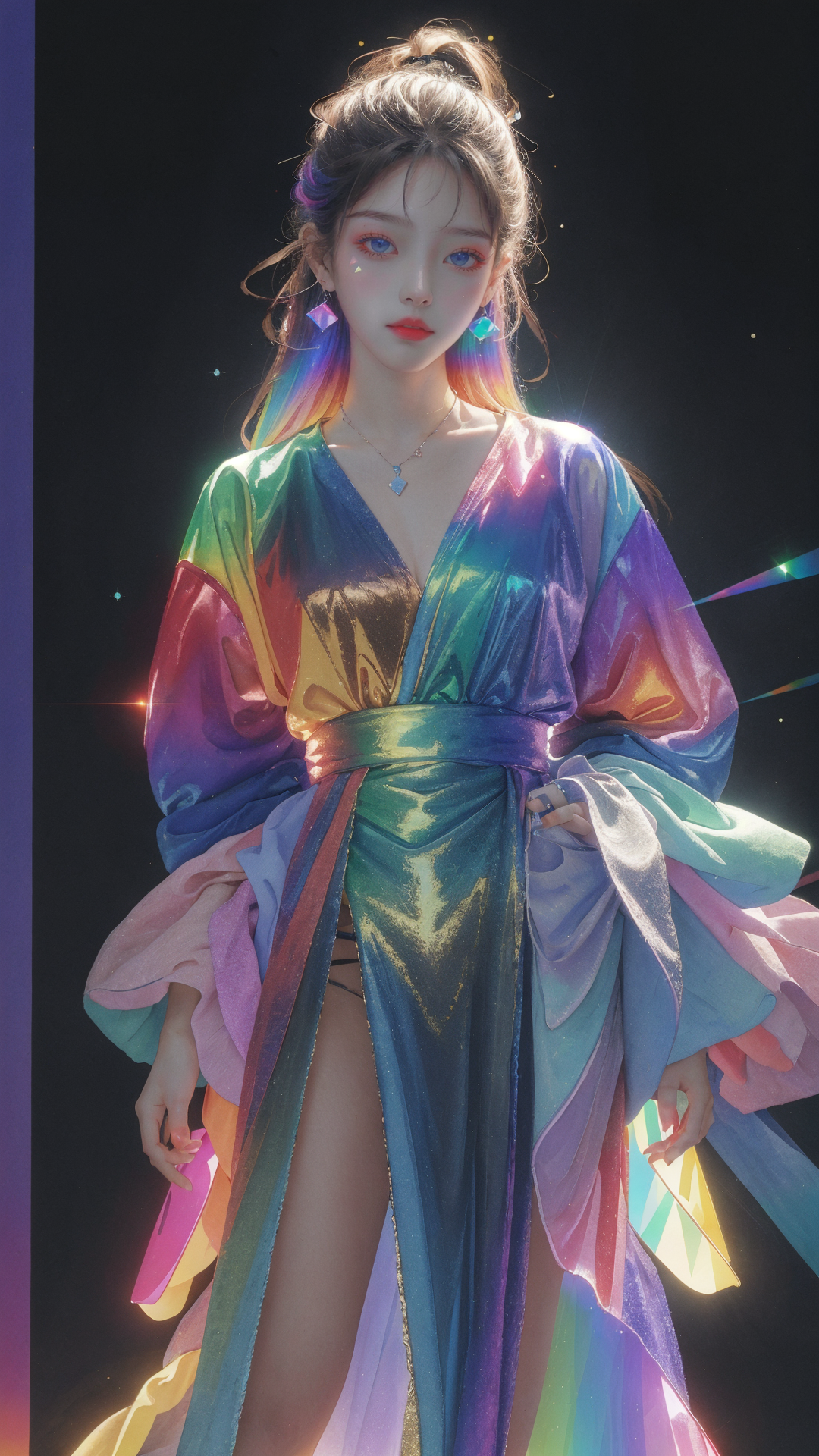 masterpiece, best quality,highres, 1girl, perfect stature, fashion pose, bangs, <lora:liuli:0.6>, chromatic dispersion,(metallic_lustre:0.8), (tansparent_plastic:1.3), coloured glaze, Polychromatic prism effect, rainbowcore, iridescence/opalescence, glowing colors, aluminum foil, Glowing ambiance, <lora:anxiang:0.4>