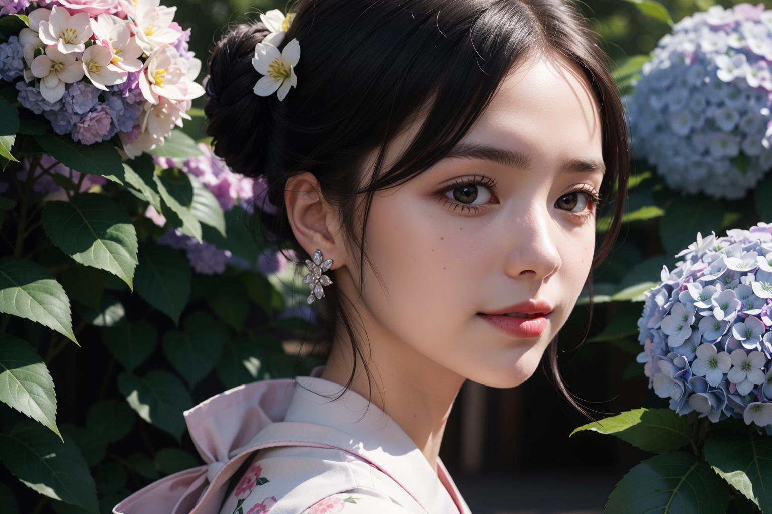 1girl, (kimono), updo, summer, cinematic, kanzashi, kamakura \(city\), hydrangea, looking at another, feminine gesture, smile, portrait, vivid, masterpiece, top quality, best quality, official art, unity 8k wallpaper, highres, ultra-high res, ultra-detailed, beautiful and aesthetic, perfect detailed face, detailed eyes, highly detailed,