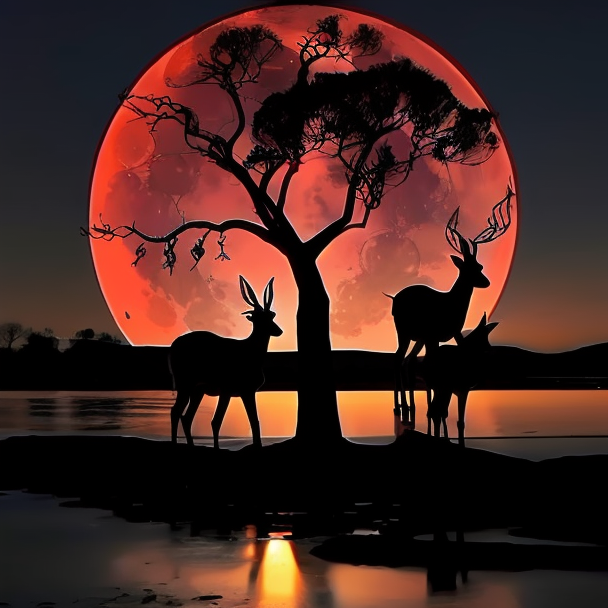 silhouette,branch, no humans, full moon, tree, horse, solo, sky, red moon, branch, bare tree,deer,Deer drinks water <lora:mood-000004:0.8>