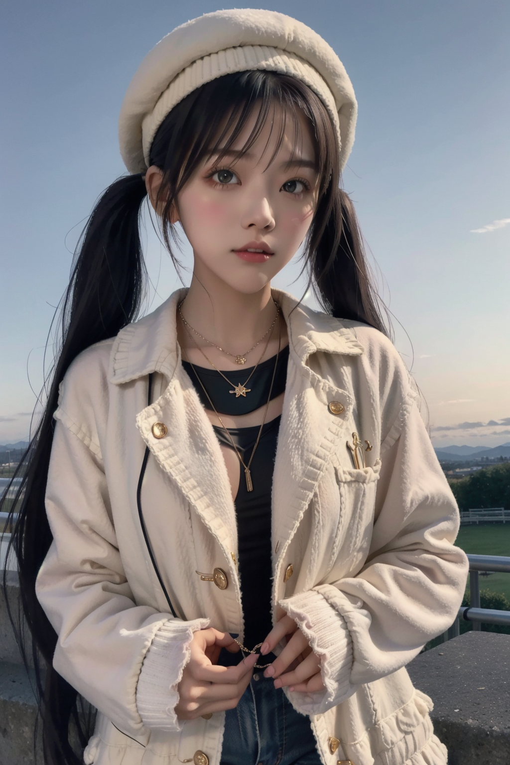 <lora:doll6:0.6>1girl, twintail, upper_body, Teddy bear coat, Skinny jeans, Ankle boots, Beret, and pendant necklace., Dramatic sunset over a serene countryside