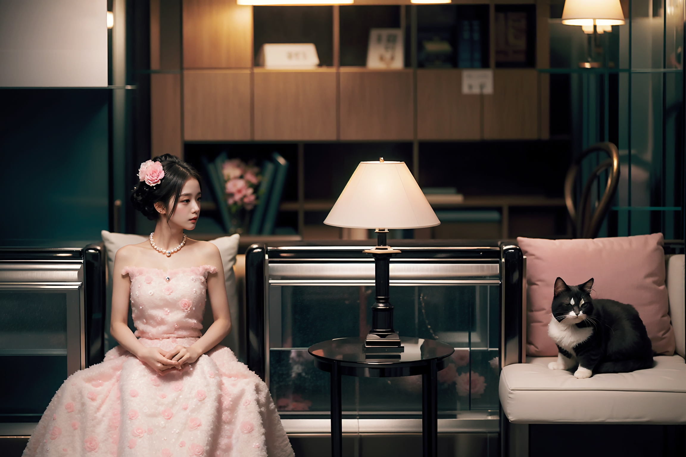 1girl, updo, pearl necklace, black dress with pink flowers pattern, fluffy cat, <lora:makina69_jisoo_v2.3:1>