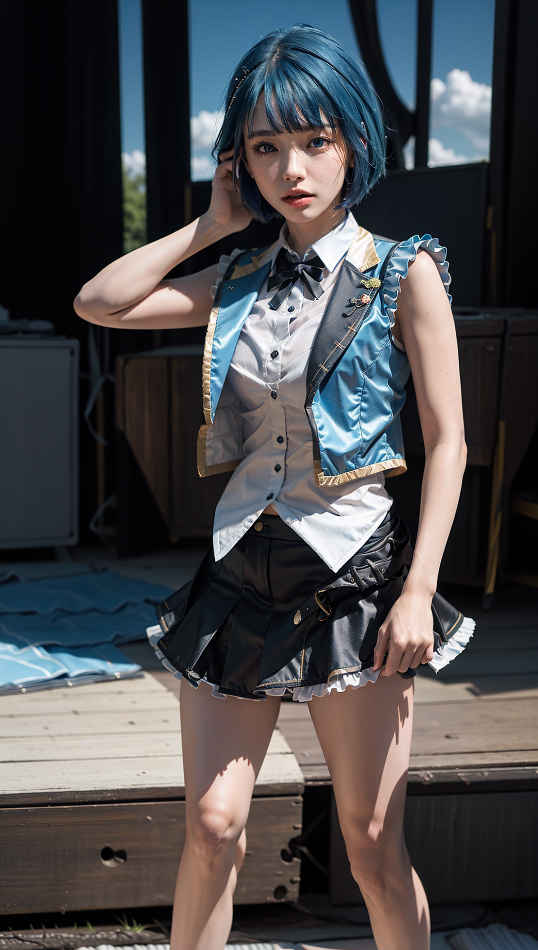 (8k, RAW photo, best quality, masterpiece:1.2), (realistic, photo-realistic:1.37), ultra highres, depth of field, chromatic aberration, caustics, Broad lighting, natural shading,Fujifilm XT3,masterpiece,ultra detailed, idol clothes,1girl, solo,blue hair,standing, looking at viewer,outdoors,full body, stage <lora:idol clothes_01:0.7>