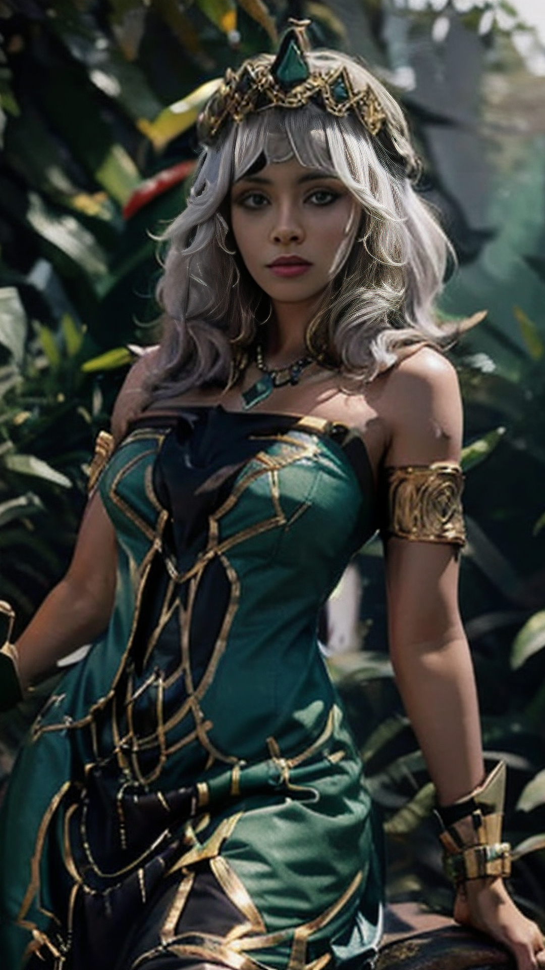 modelshoot style, (extremely detailed CG unity 8k wallpaper), full shot body photo of the most beautiful artwork in the world, medieval queen, green vale, dark skin, black woman, golden crown, diamonds, trending on ArtStation, trending on CGSociety, Intricate, High Detail, Sharp focus, photorealistic painting art by midjourney and greg rutkowski, 1girl, solo, medium hair, bangs, dark-skinned_female , dark skin, crown , white hair, jewelry, makeup, yellow eyes, symmetrical eyes, looking at viewer, perfect eyes, detailed face+eyes, nature background, parted lips, nail polish, green dress, portrait, <lora:QiyanaV2:1>