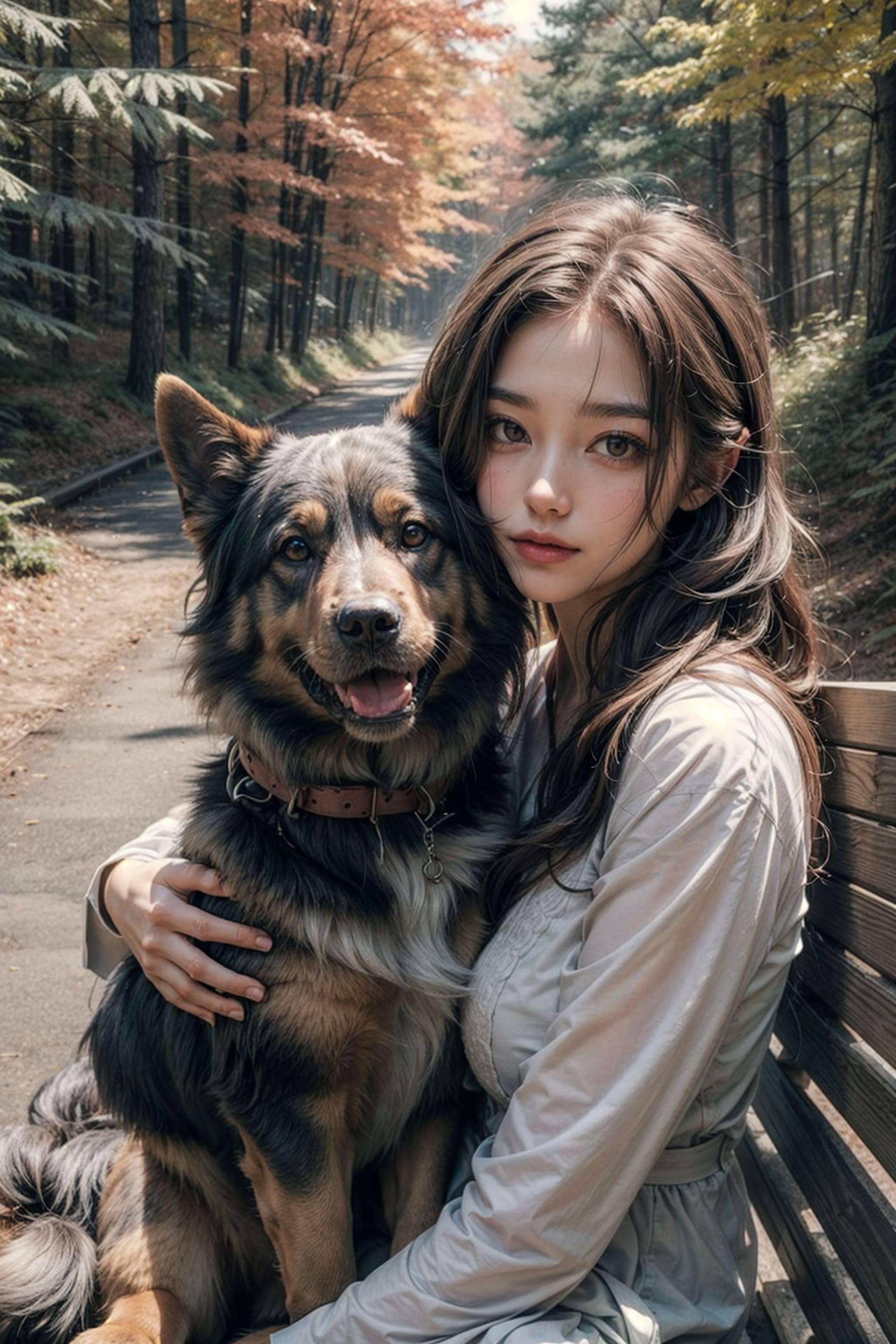 ((Best quality)), ((masterpiece)), ((highly intricate details)), beautiful lighting, 1girl, from the front, playing with dog, german shepard, cuddling with dog, happy dog, thicc eyebrows, brown_silver_hair, autumn, forest in background, daytime, <lora:add_detail:1.4>