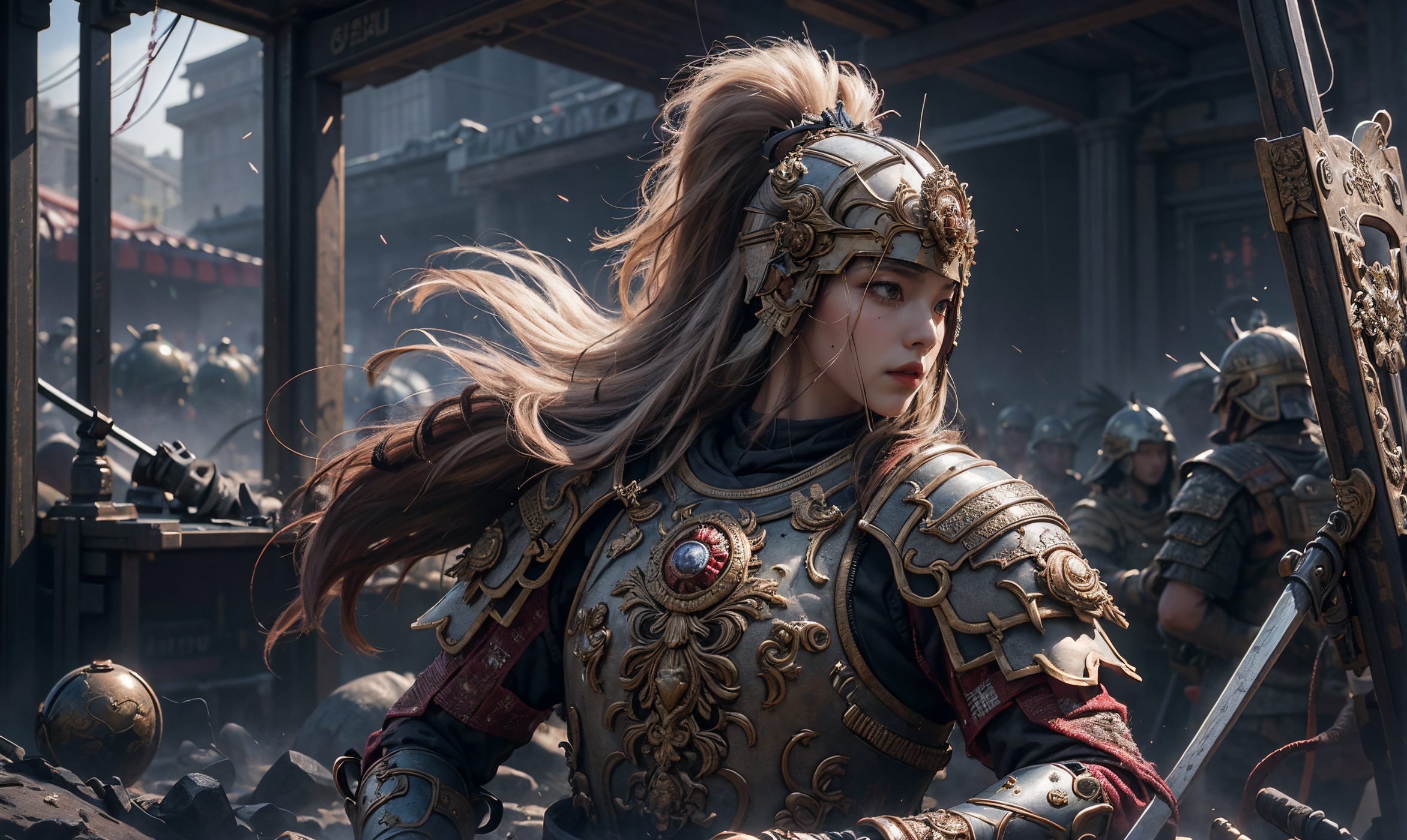 (RAW photo, best quality), (realistic, photo-realistic:1.30),8k uhd, dslr, soft lighting, high quality, film grain,(1girl) with long hair standing in front of a battlefield,ponytail, blood on face, full body, warrior, big hair, epic artwork, ruined scene, fire, wide-angle, cinematic lighting, eaba,golden ratio, exaggerated facial expressions, <lora:EABA_v1:0.8:MIDD> <lora:add_detail:0.4>, masterpiece,ultra realistic,32k,extremely detailed CG unity 8k wallpaper, best quality, masterpiece,ultra realistic,32k,extremely detailed CG unity 8k wallpaper, best quality