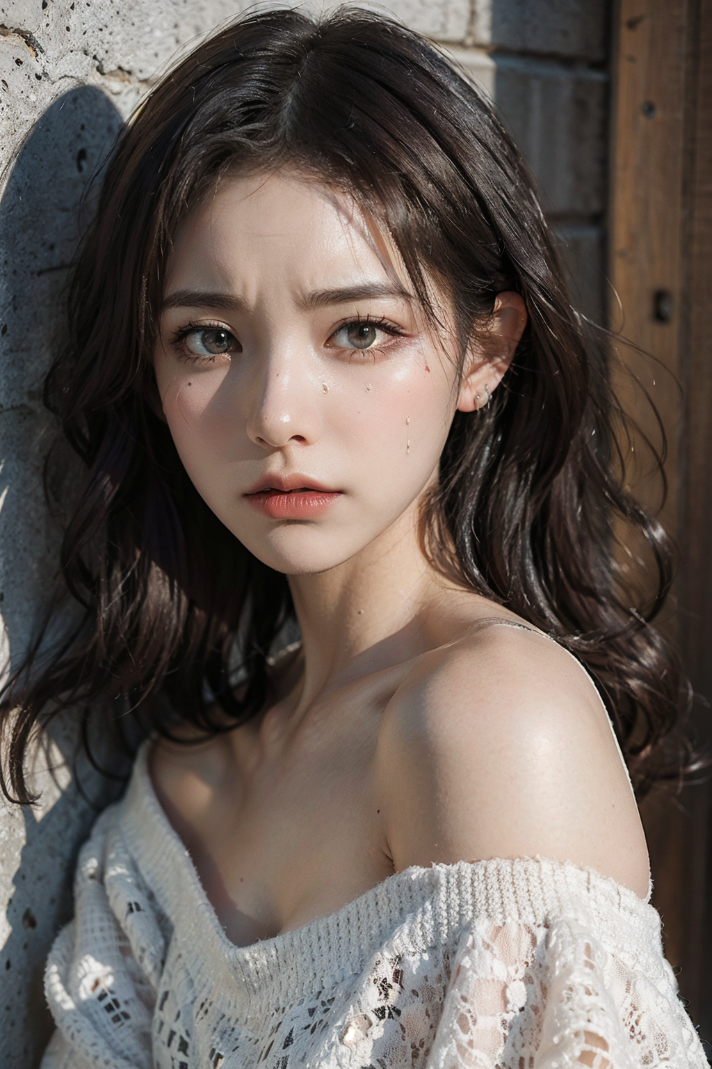 Best quality,masterpiece,ultra high res,(photorealistic:1.4),raw photo,(Authentic skin texture:1.3),(film grain:1.3),panorama,character portrait,very wide shot,narrow waist,cowboy shot,(in the dark, deep shadow, low key, cold light,) night,close-up,streaming tears, indoor,dust,Tyndall effect,sad,disappointed,gloom (expression),sitting,(against wall),crying,frown,(head bowed),nervous,tearing up,lonely, 1girl,beautiful detailed eyes and face,white jabot,off shoulder,brown eyes, <lora:FilmgirlLora_v30:0.6> <lora:asianGirlsFace_v1:0.4:FACE>,