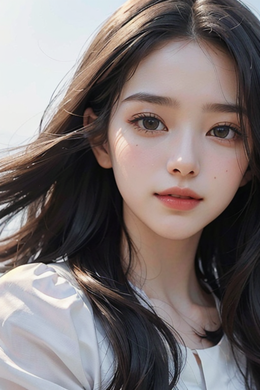 official art, masterpiece, best quality, unity 8k wallpaper, ultra detailed, extremely detailed, elegant, beautiful, aesthetic, romanticism, 1girl, beauty, small face, smile, pale skin, (brown eyes), black long hair, (hair blowing in the wind), ((detailed long hair)), frontal shot, (close up:1.4), face focus, ((white background)),