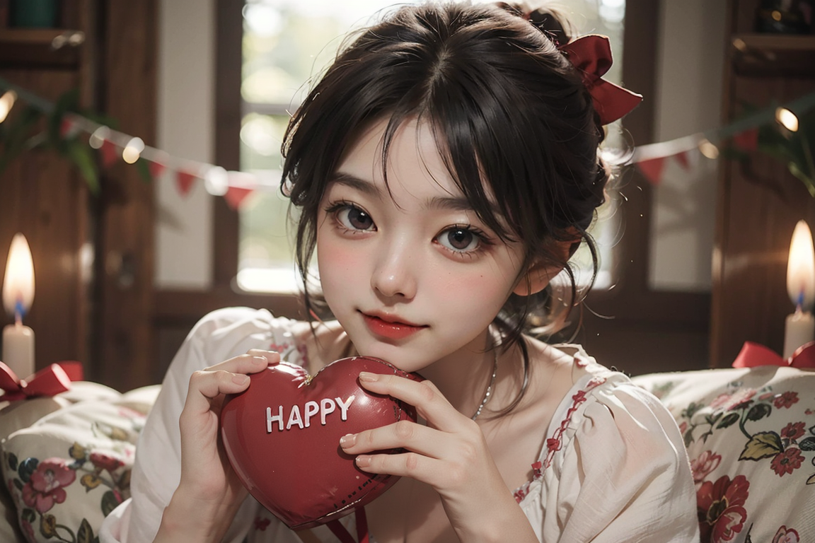 1girl, solo, wide-eyed, blushing face, playful,kawaii coverage, birthday gift,(red ribbon), surprise, love, heart-shaped locket,roses,heartfelt, blissful, charming, affectionate, sweet, cherish, enchanting, intimate, passion, joy, happiness, eternal, forever <lora:OC:0.15> <lora:PerfectNwsjMajic_4:0.4:FACE0.5>