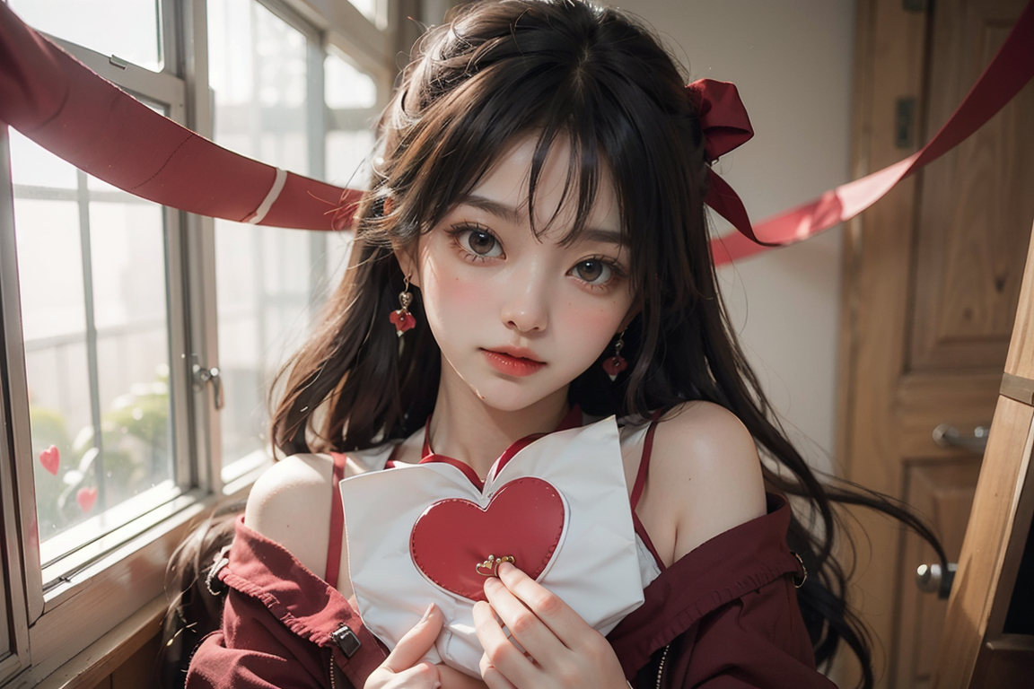 1girl, solo, wide-eyed, blushing face, playful,kawaii coverage, birthday gift,(red ribbon), surprise, love, heart-shaped locket,roses,heartfelt, blissful, charming, affectionate, sweet, cherish, enchanting, intimate, passion, joy, happiness, eternal, forever <lora:OC:0.15> <lora:BeautyNwsjMajic2:0.4:FACE0.5>