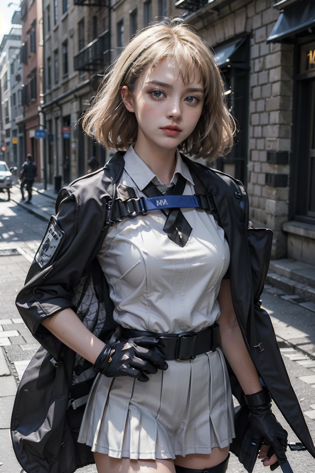 Best quality, masterpiece, ultra high res, (photorealistic:1.4), 1girl, light frown, serious, upper body, hands on hip, original_outfit, black jacket, white shirt, white skirt, blonde hair, blue eyes, pleated skirt, black thighhighs, blue harness, blue belt, black gloves,tactical clothes, ahoge, european <lora:RussianDollV3:0.2> <lora:add_detail:0.1> <lora:acr:1.0>