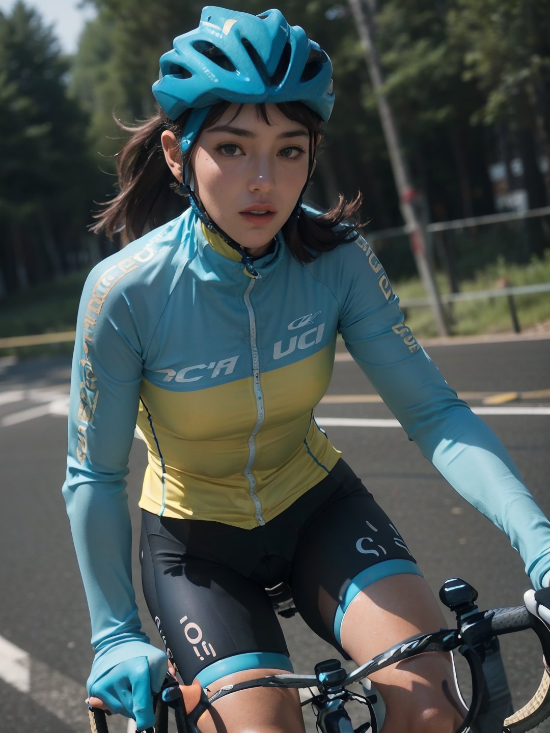 (a woman who is a (cyclist):1.4), (extremely detailed hyperrealistic masterpiece, best quality, high resolution uncompressed raw photo:0.9)
