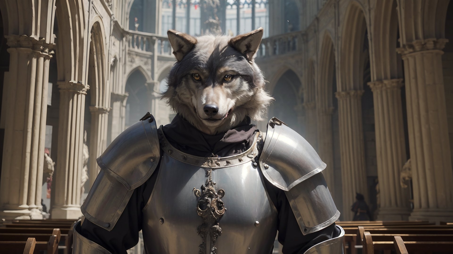 upper body photo of ((anthropomorphic:1.2) ([wolf|hound]):1.55) knight, (extremely detailed hyperrealistic masterpiece, best quality, high resolution uncompressed raw photo:0.8), wearing ancient ((european) armor:1.2), (stern:1.2) warrior, valiant, (medieval europe:1.3), holding a halberd, inside a cathedral, godrays